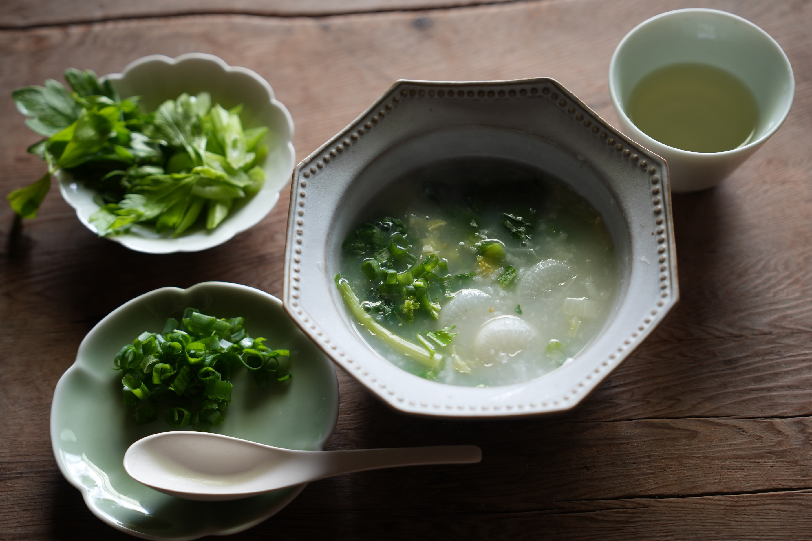 先將耐燉的白菜、蘿蔔下鍋,與米粥同煮,然後是需要煮透的芥蘭苗、大豆苗,最後是帶來香味的蔥、山茼蒿、芹菜管,就可以熄火盛出了。有白菜、蘿蔔的甜味底,又有許多豐富的鮮香味,這樣的七草粥,我可以整個春天都吃。