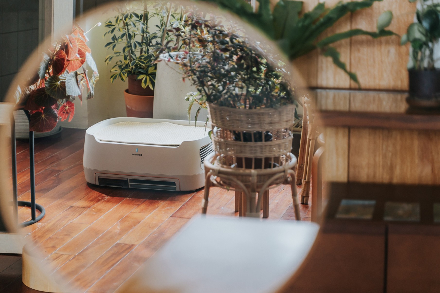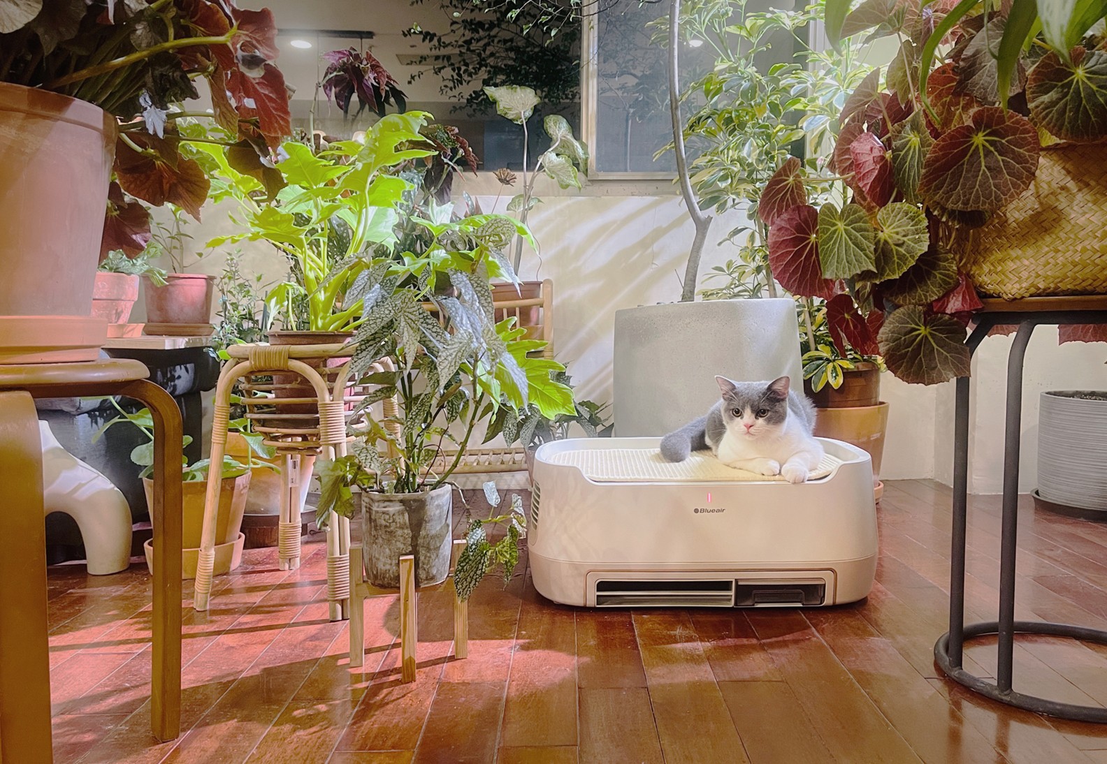 本身就是建築背景的她,覺得Blueair Bururu 寵物空氣清淨機低矮的量體設計,讓貓咪可以很輕鬆自在地接近,不同於常見的機身偏高的空氣清淨機對寵物來說會較難接近。她同時搭配一些植栽在周邊,讓喵喵們在清新氣流中更加放鬆自在的享受貓生。
