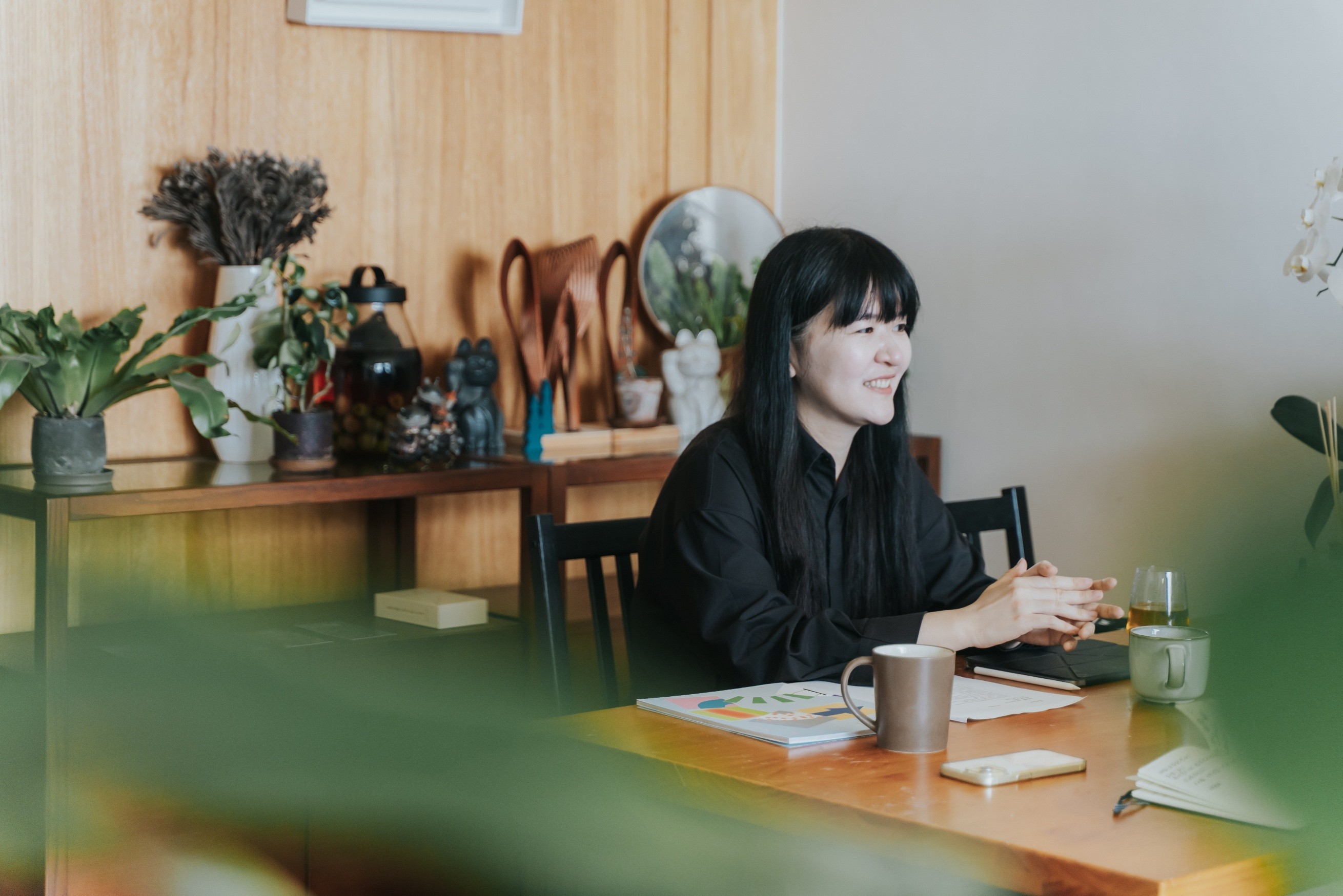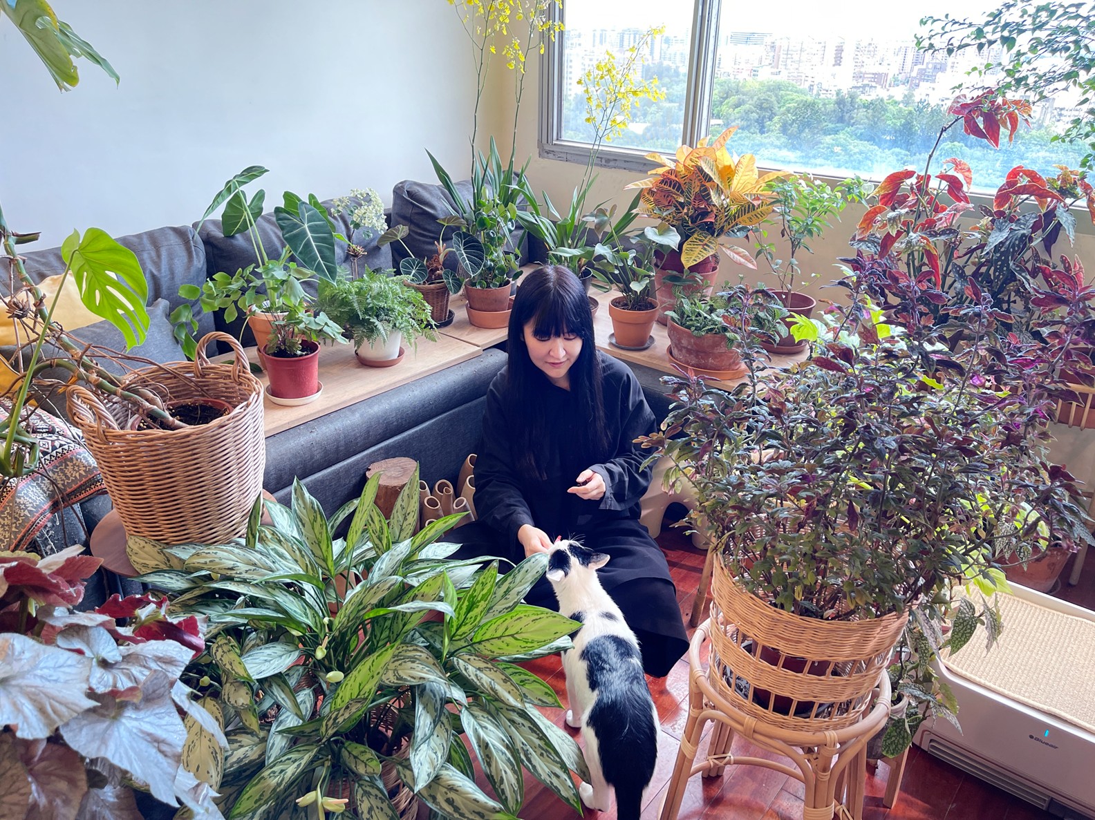 在綠意與木質交織的空間裡,還有兩隻貓咪——胖胖與肥肥,相較於貓咪們的害羞,曾令理則大方地分享她的設計靈感、對空間的感知語言,以及如何在毛孩的陪伴下,一起渡過每天的創作日常。
