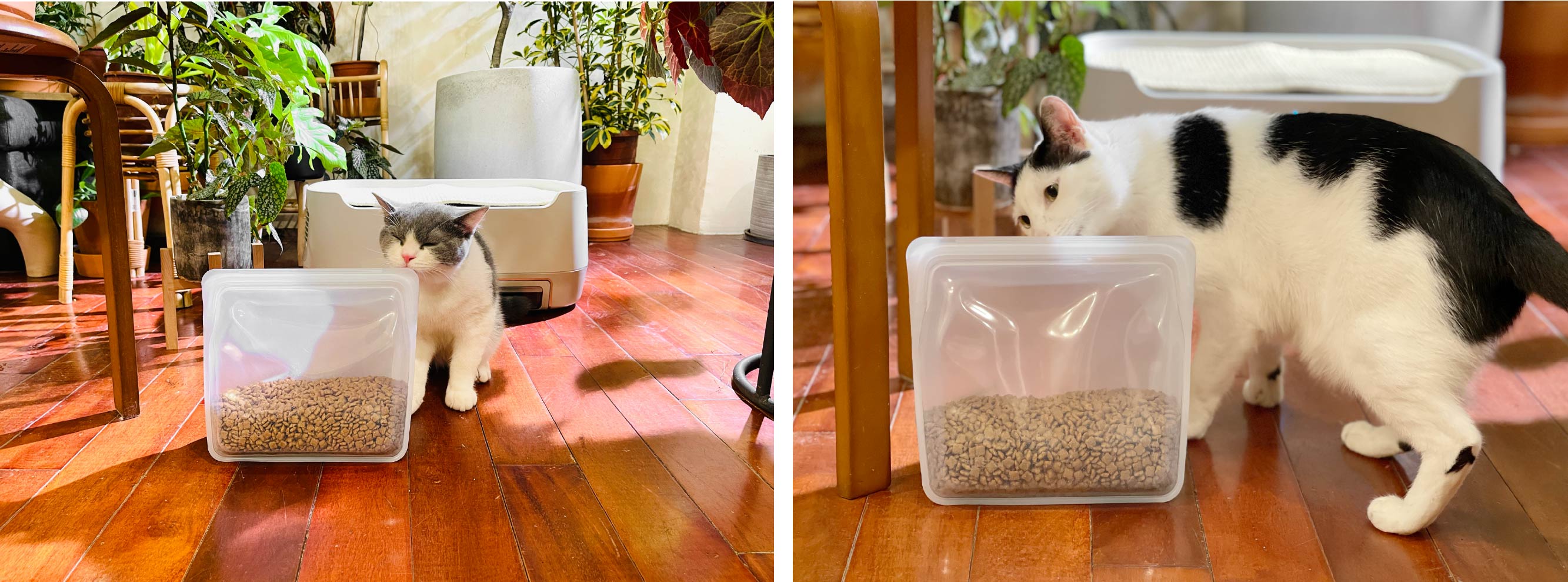 令理將Stasher站站及碗型矽膠密封袋作為貓糧的分裝工具,由於站站矽膠密封袋底部是三角形結構,三角面做得穩固,實際容量會遠比看起來還要大幾乎可以裝下一公斤的貓糧。透明的外觀也能一眼看到飼料剩餘多少,再加上密封設計,就不用擔心螞蟻會跑進去,貓糧也可以維持在貓咪覺得好好吃的狀態。從外型設計到收納性都非常方便。