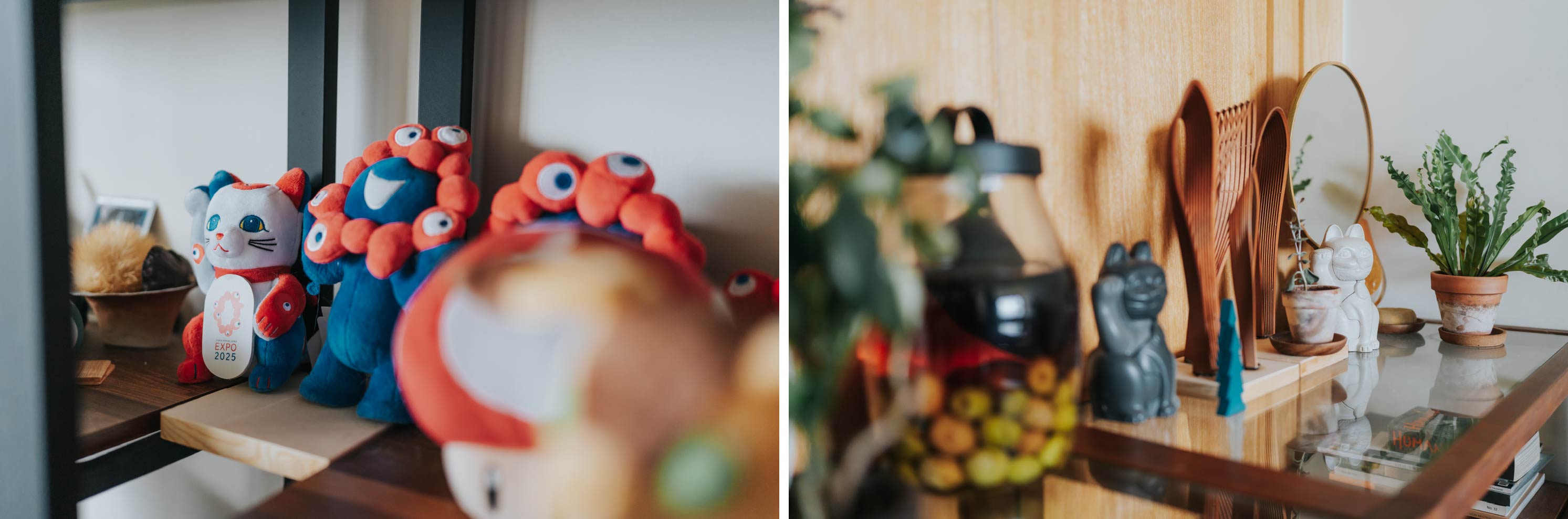 令理家中充滿各種貓咪擺設,還有大阪萬博限定的招財貓和吉祥物脈脈