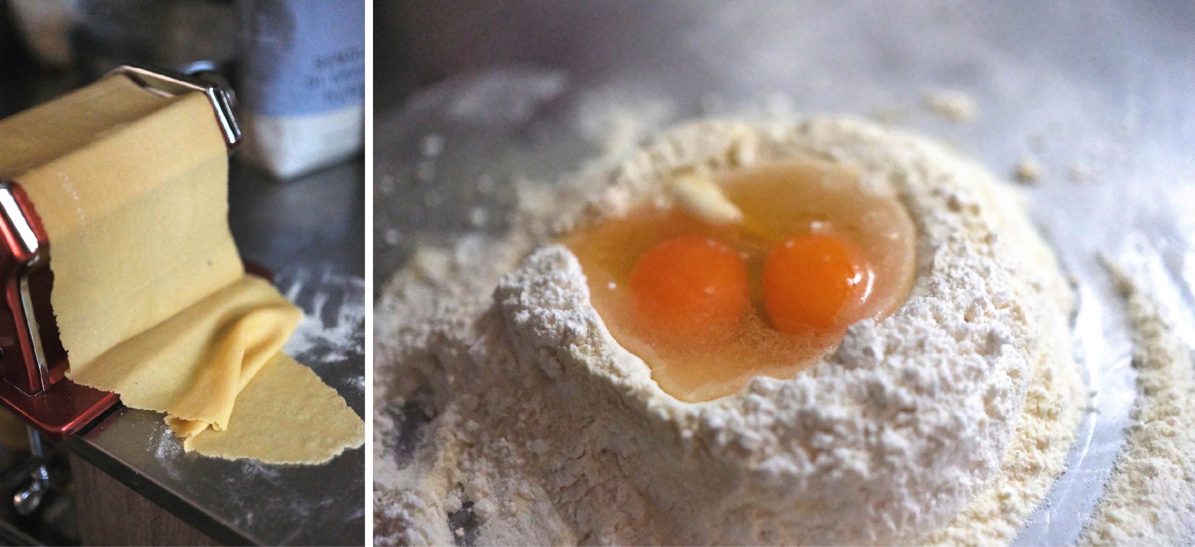 取杜蘭小麥麵粉與普通麵粉混合,我的比例抓在 6:4 左右,杜蘭小麥粉蛋白質成分高,是義大利麵具有爽韌口感的原因,混合一般麵粉,則是為了保有唇舌貪戀的溫柔柔軟。麵粉混好,在桌上堆成一座麵粉小山,中間挖個洞,打入雞蛋,拿叉子攪散,就可以開始揉麵啦。