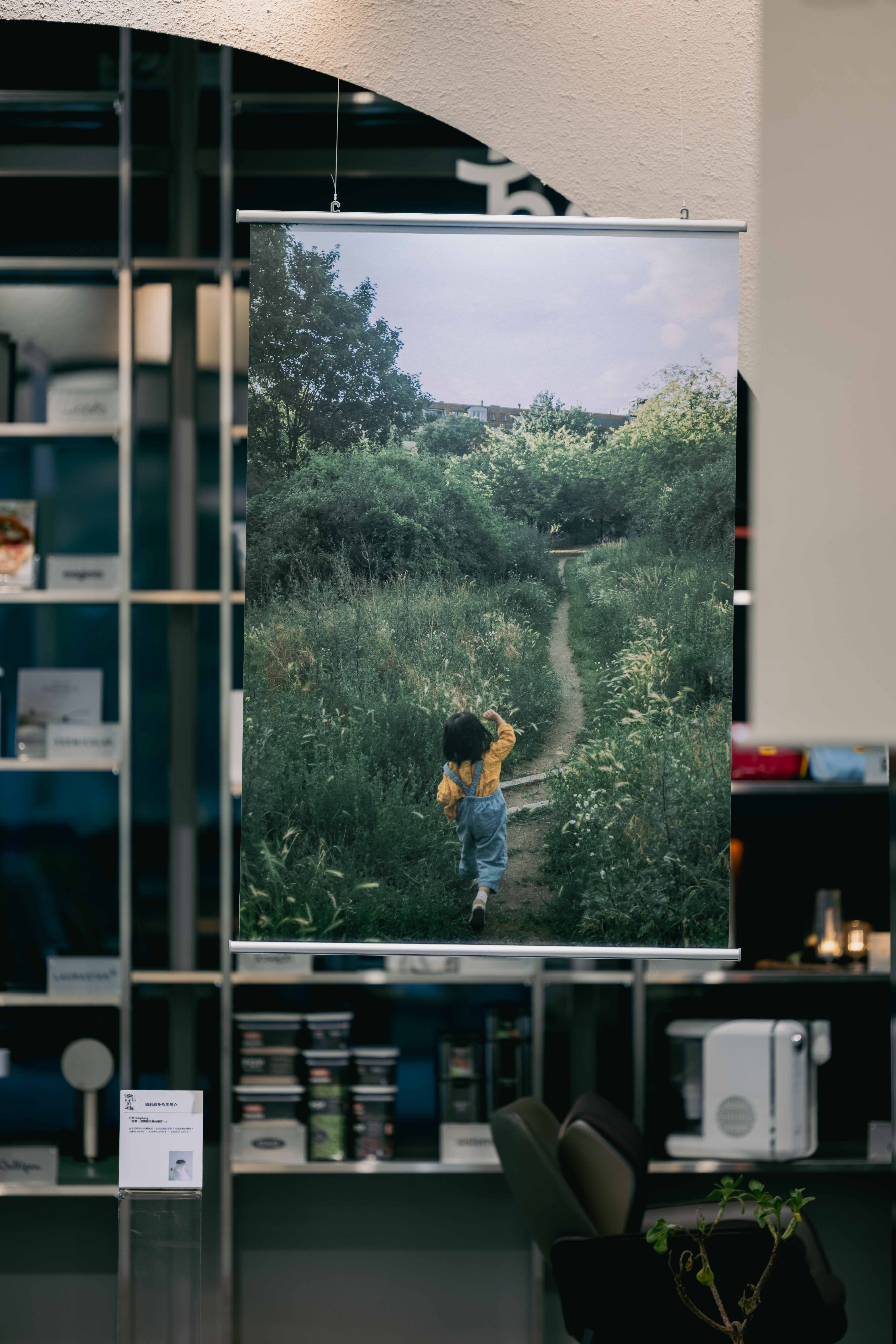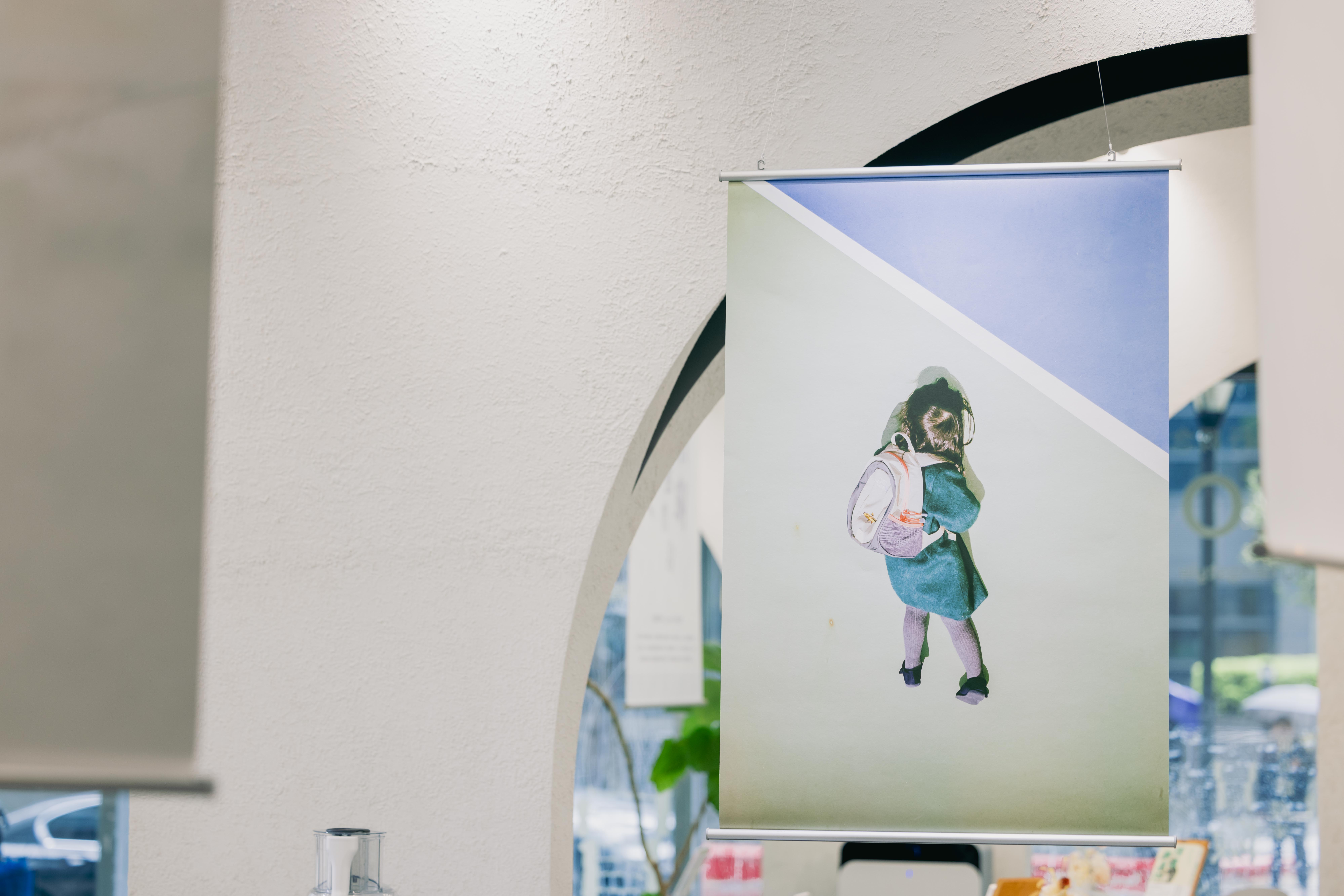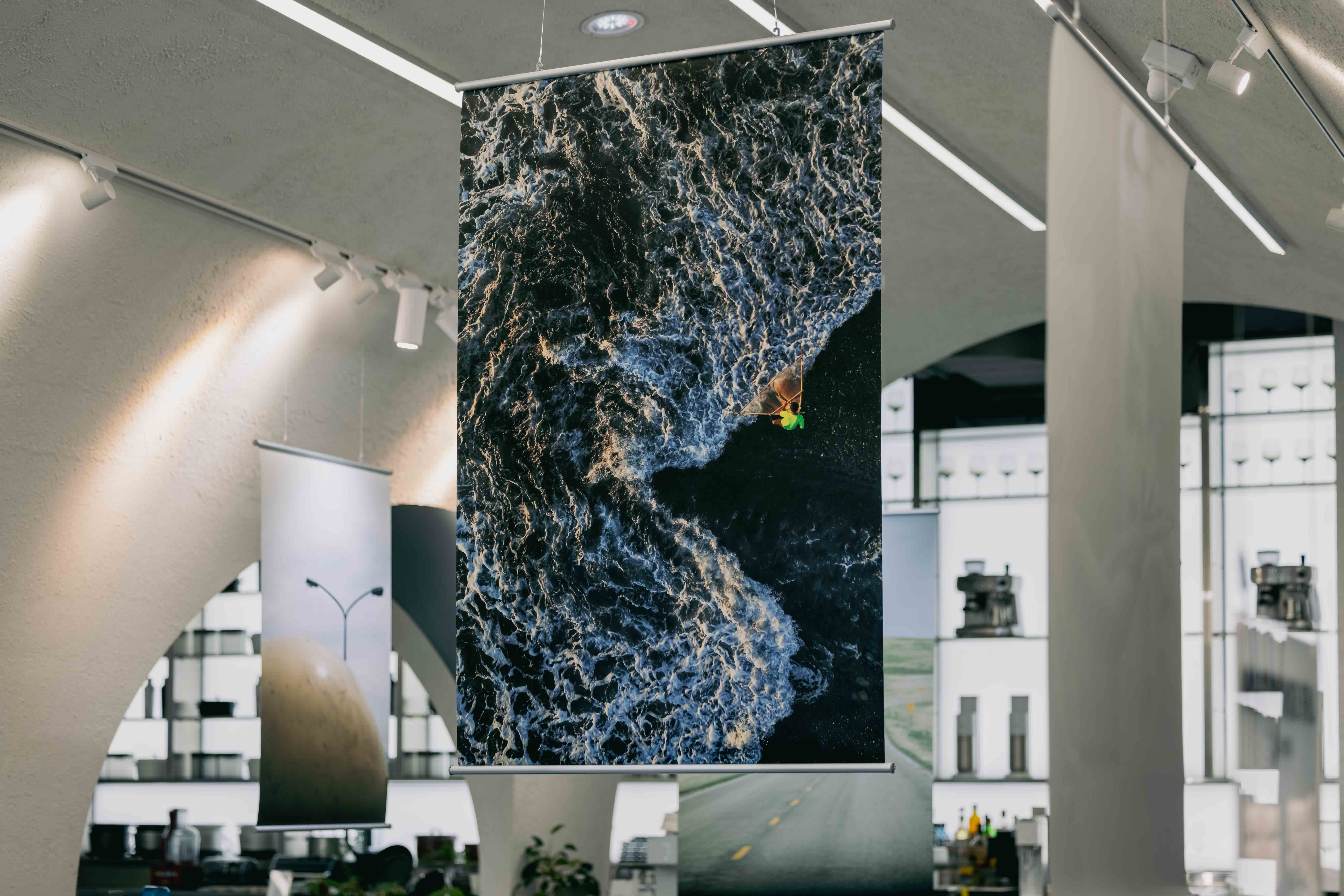 走進展場,攝影作品以錯落的高度懸掛於空間之中,以依循畫面的節奏與視覺動線,決定每一幅作品的高度與位置。林韋言的空拍作品被刻意懸掛在須仰頭才能望見的地方,觀眾彷彿化身為空拍攝影機,與畫面中的捕魚人一同撒網;叮咚的作品則在觀眾平視的視野中,使我們能與鏡頭中的孩子小實一同走入田野,回到孩子充滿好奇與純真的眼光,看見自然的純粹與美好;浦芝真史在宜蘭旅行時,從機車後座捕捉到安全帽與路燈重疊的瞬間。畫面中,安全帽宛如一顆行星,而路燈像從星球上生出的枝枒。當觀者的視線從安全帽移向路燈,彷彿看見行星長出枝枒,日常景象化為詩意的風景。
