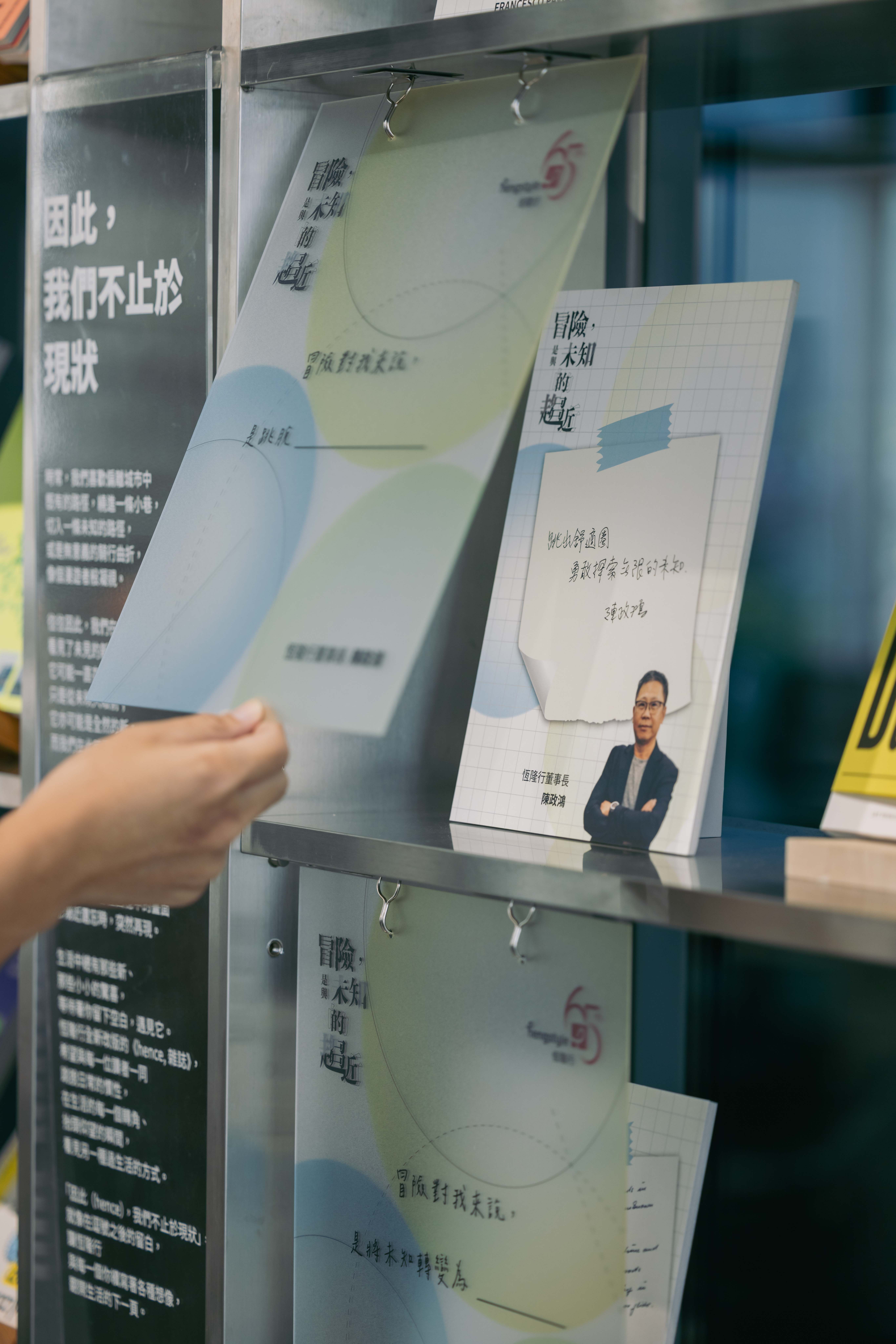恆隆行董事長陳政鴻認為:「冒險,是跳脫舒適圈,勇敢探索無限的未知。」一旁陳列的品牌專書《Be Your Daily 恆隆行——美好生活的代理》,呼應恆隆行 65 年來不斷突破「代理商」的既定框架,從生活選品、服務設計到創意企畫,持續探索並傳遞生活的更多可能。