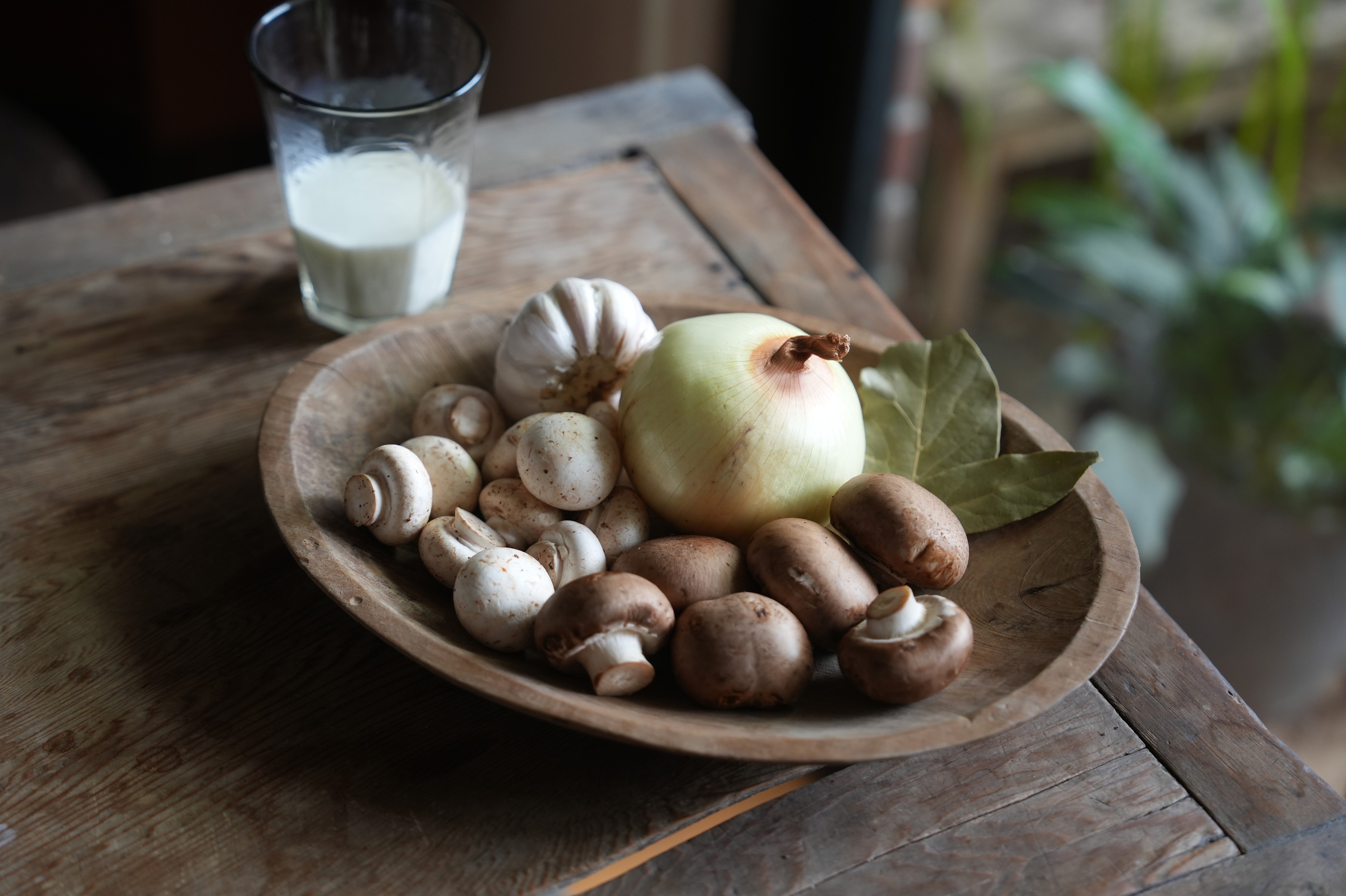 蘑菇一盒(或將其中份量換為其他菇類,乾燥有香味者會更好)、奶油十克、洋蔥一顆、高湯四百毫升(都可以增減)、月桂葉兩片、蒜一至兩瓣、黑胡椒少許、牛奶兩百毫升