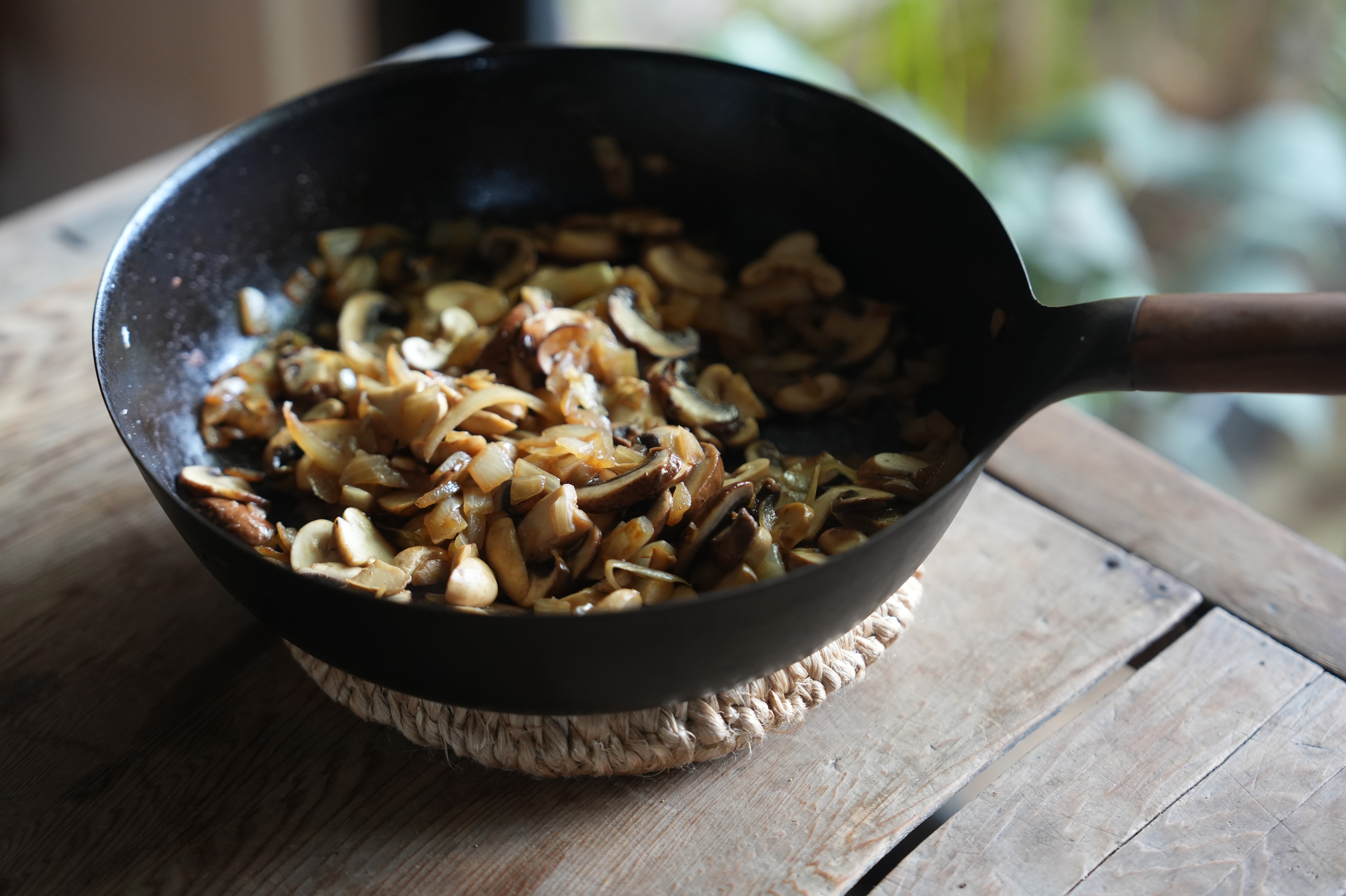 很有趣呢。先說香川蘑菇。雖然戴著一頂棕色的帽子(裡頭一樣是暖白色的),但是光在平底鍋裡炒開來偷嚐時,就發現,一樣帶著濃郁有奶油香的大地味,然而有一點點香氣往上飄揚,其實是比白色蘑菇稍稍清鮮一點點的呢。