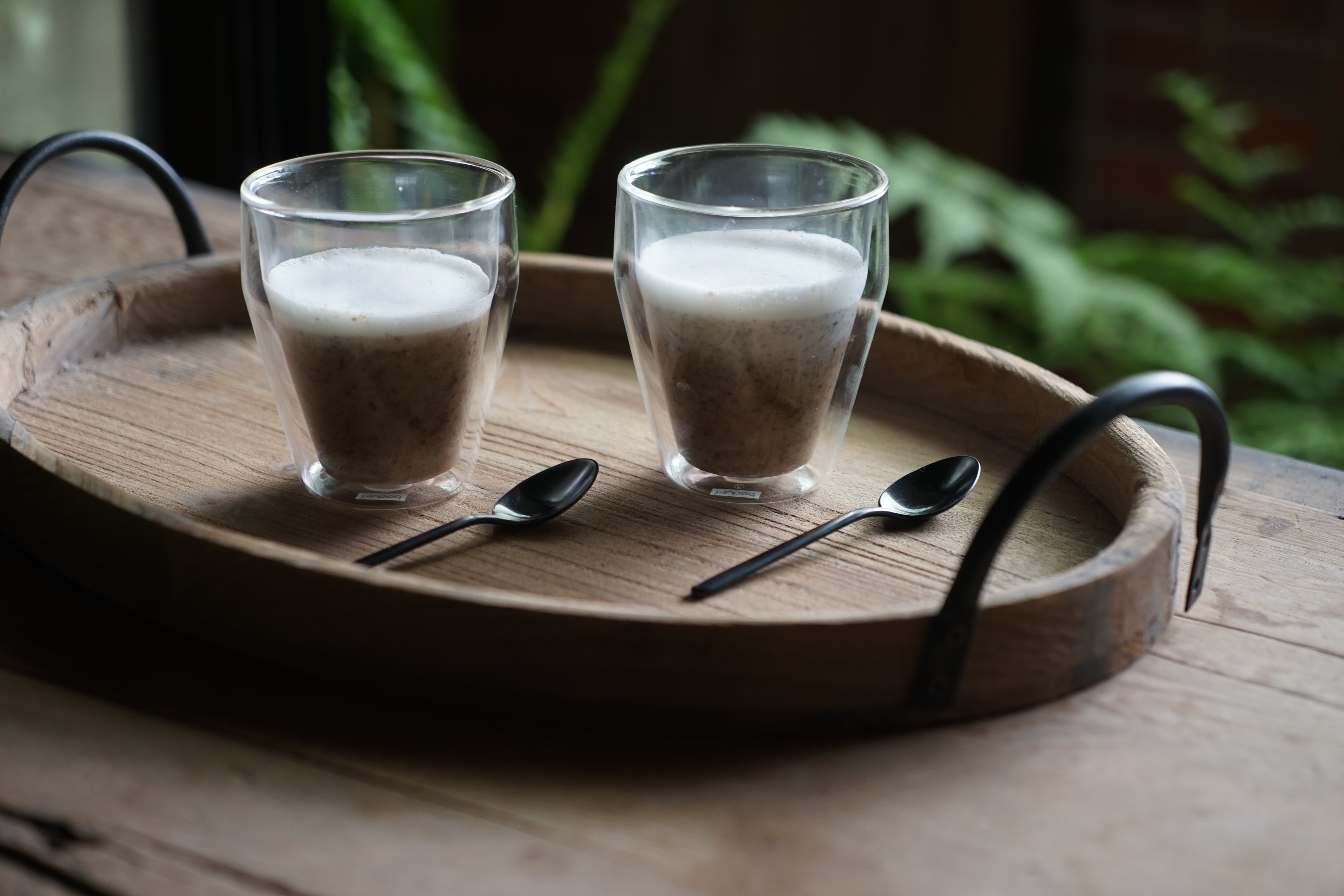 但盛裝蘑菇卡布奇諾濃湯的時候,太可愛了。潔白的奶泡在最上層,然後可以從透明的玻璃杯身看到,像雪融似的,一點一點滲透進暖棕色的蘑菇濃湯裡,從淺淺的卡其色,一直到杯底濃濃的深褐色為止,勾人食慾。