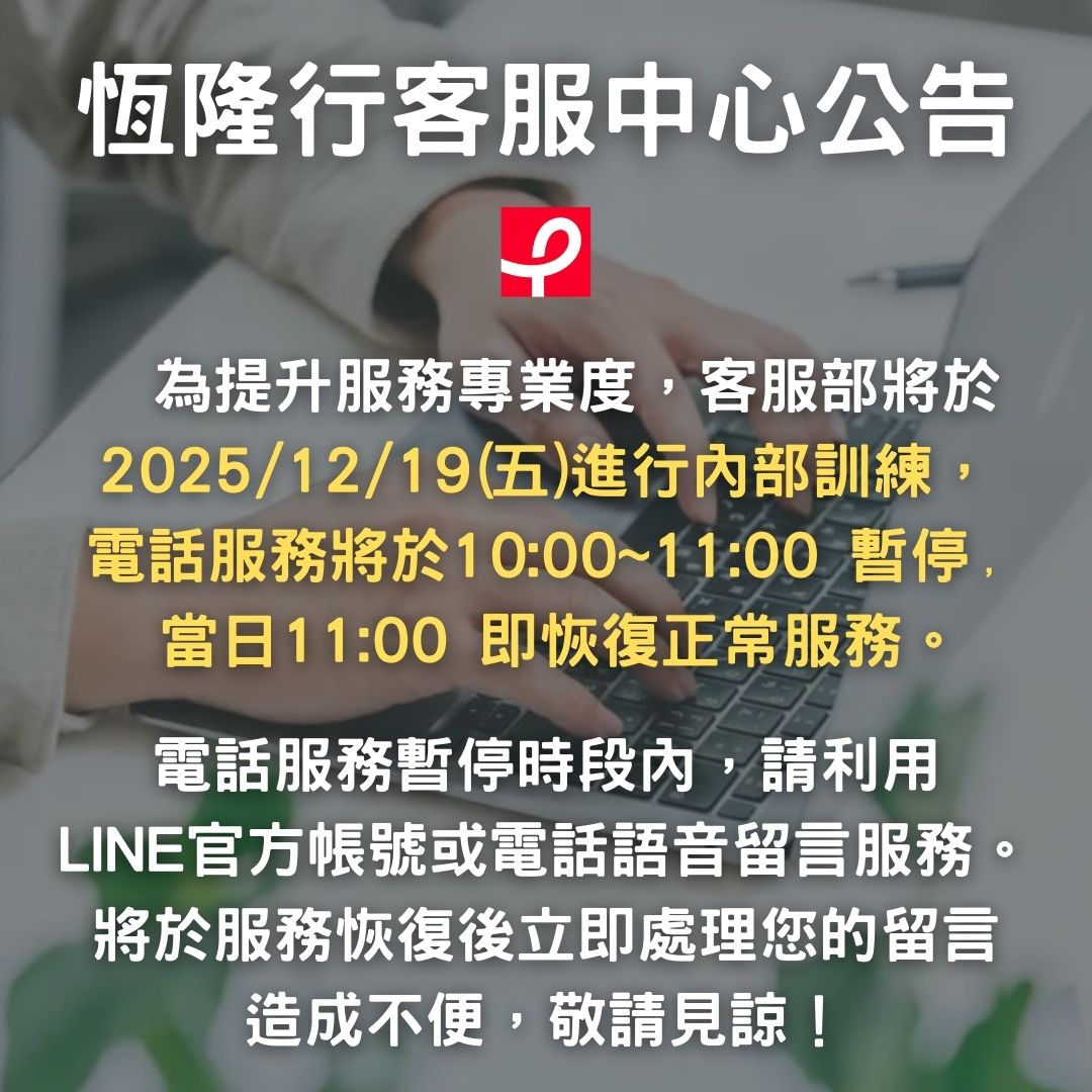 為提升服務專業度,客服部將於2025年12月19日(五) 進行內部訓練,屆時電話服務將暫停。