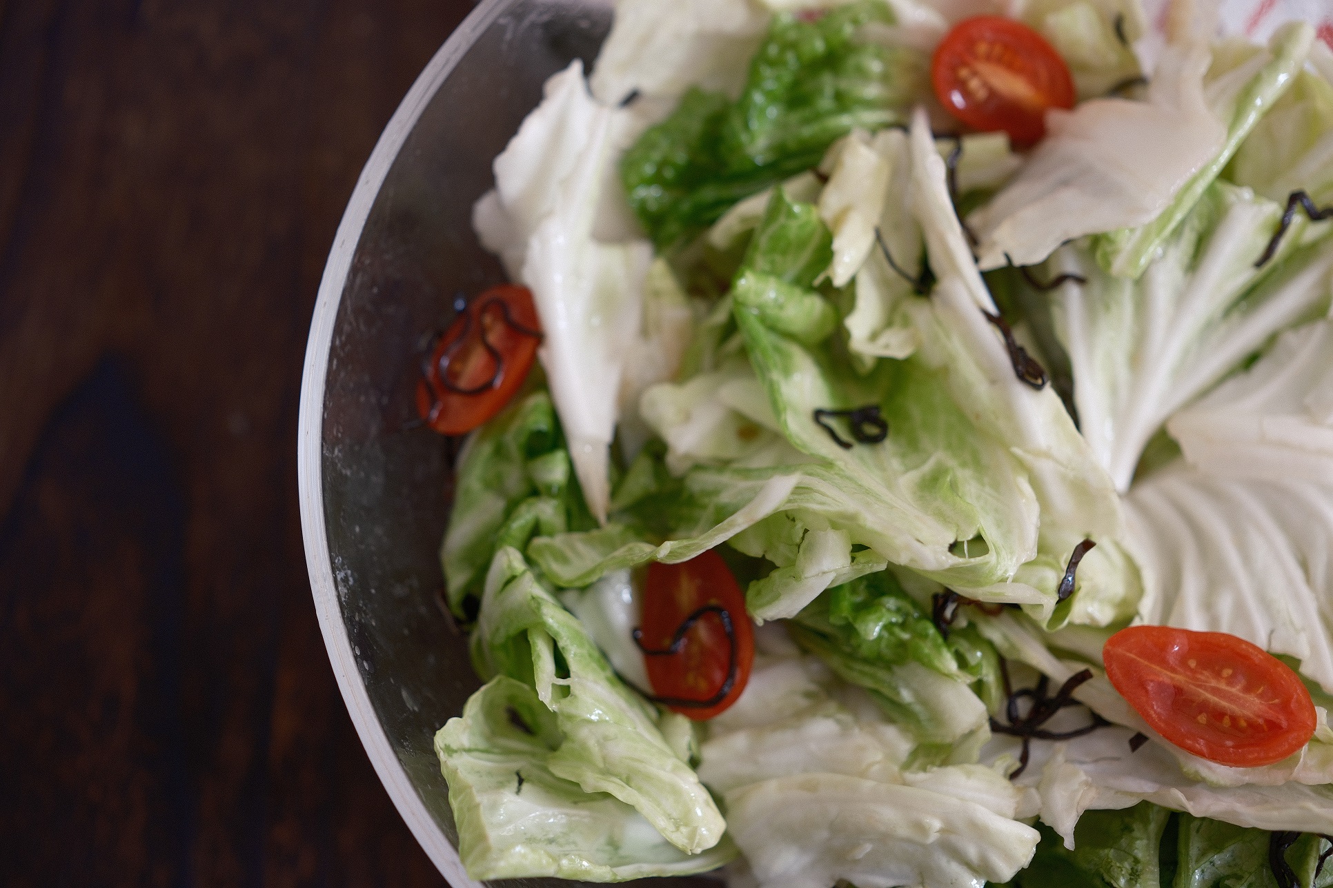 我在林泉的居酒屋裡吃到很喜歡的鹽昆布沙拉,清脆的沙拉葉,淋上麻油,加上鹽昆布。等到昆布吸收水分,釋放鹽味與旨味,哇——簡直不要太好吃。