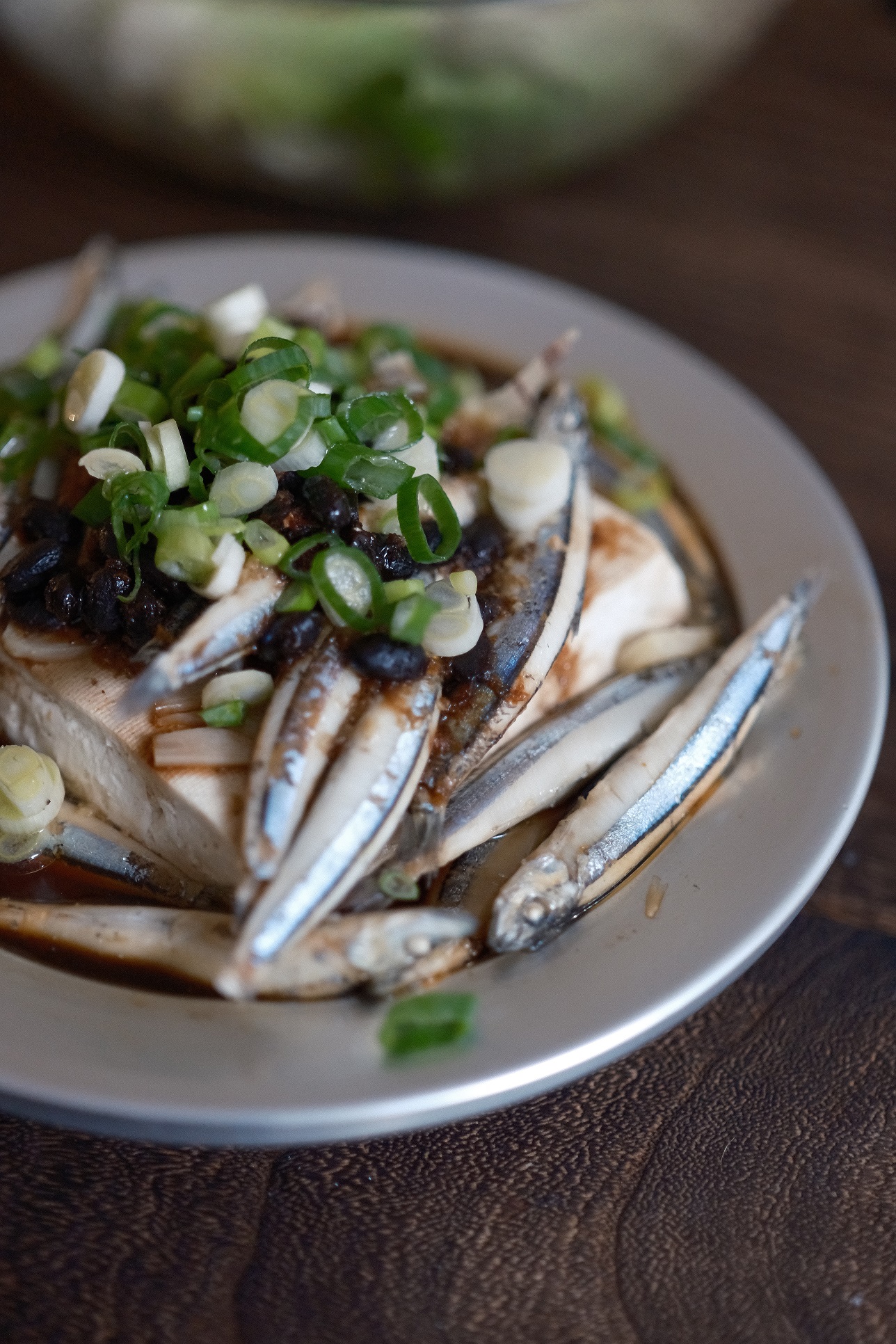 別看這些魚身長跟手指頭差不多,他們已經「熟透了」,不少都抱了卵。取一塊傳統板豆腐,放上薑末,把所有的丁香魚嘩地堆上去,淋上醬油、黑糖、豆豉混合的醬汁,蒸個 10 分鐘,就是好吃的丁香魚豆腐。