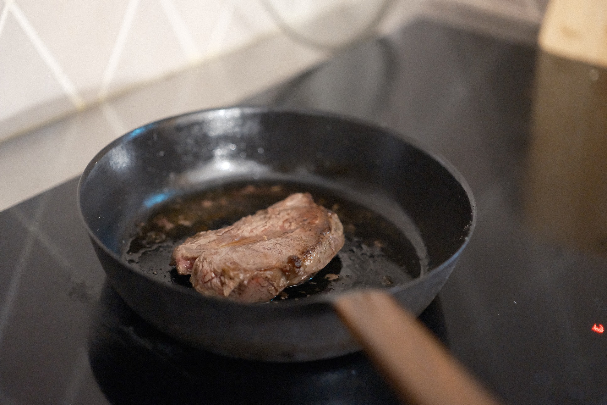 使用 VERMICULAR 琺瑯鑄鐵平底鍋來煎牛排。這隻鍋子的優點在於加熱快,導熱佳,很快就可以把牛排表面煎炙焦香,待到上色,熄火讓牛排肉在鍋內慢慢休息,吸回肉汁,讓肉中心給餘熱滲透,一點點焦心的等待,是讓肉排好吃的方法。