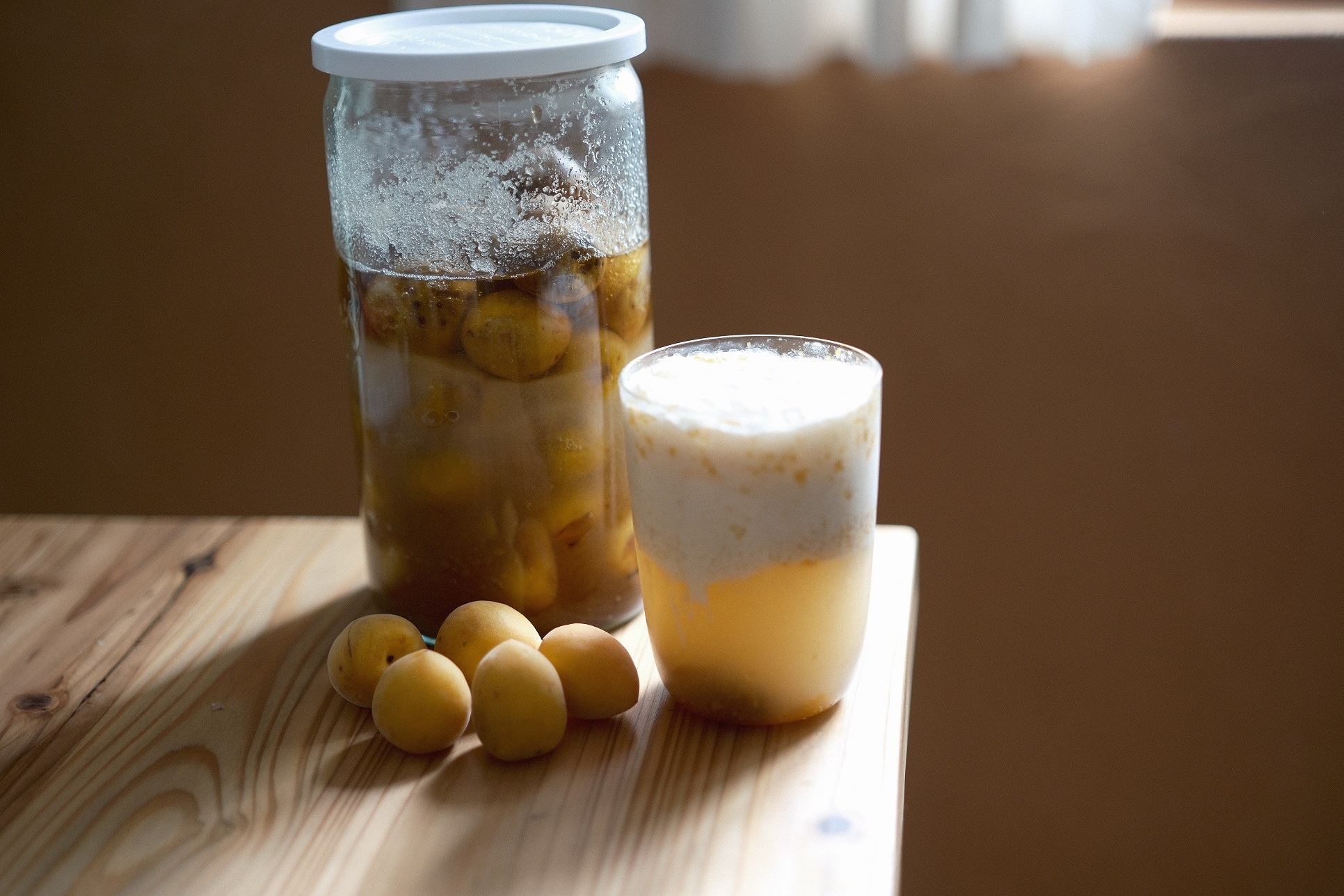 使用芬芳的黃梅,表皮戳上孔洞後,加入二砂糖,等到梅汁跟糖融合,入鍋煮過微沸熄火,冷卻後收起來,不需等到發酵,即可使用。