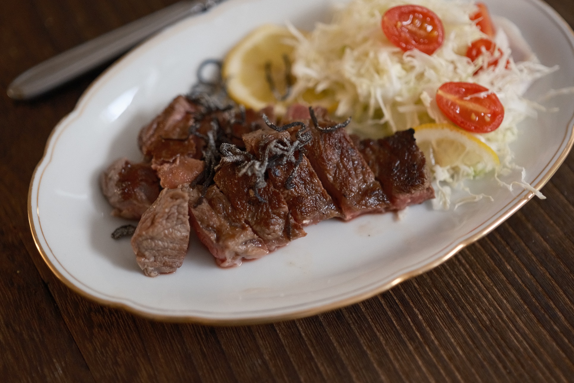 剩下的高麗菜拿來刨絲放在牛排旁邊當配菜,完整和風洋食的設定。
