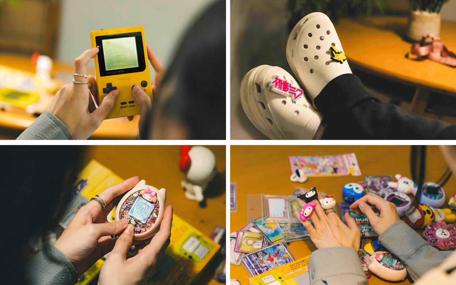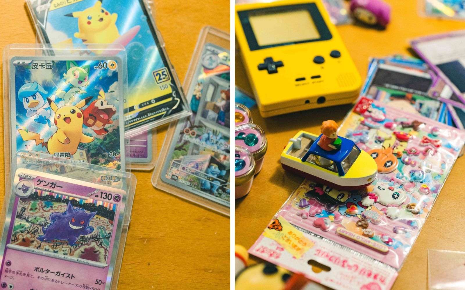 她得意地拿出三麗鷗聯名的電子雞,粉紅色的外殼上有特殊的塗裝,裡面的寵物甚至是三麗鷗的角色;另一個美國麥當勞限定的設計師聯名公仔,是她拜託朋友特別從美國帶回來的;近期更是迷上了寶可夢卡片,正深陷無盡的黑洞中。