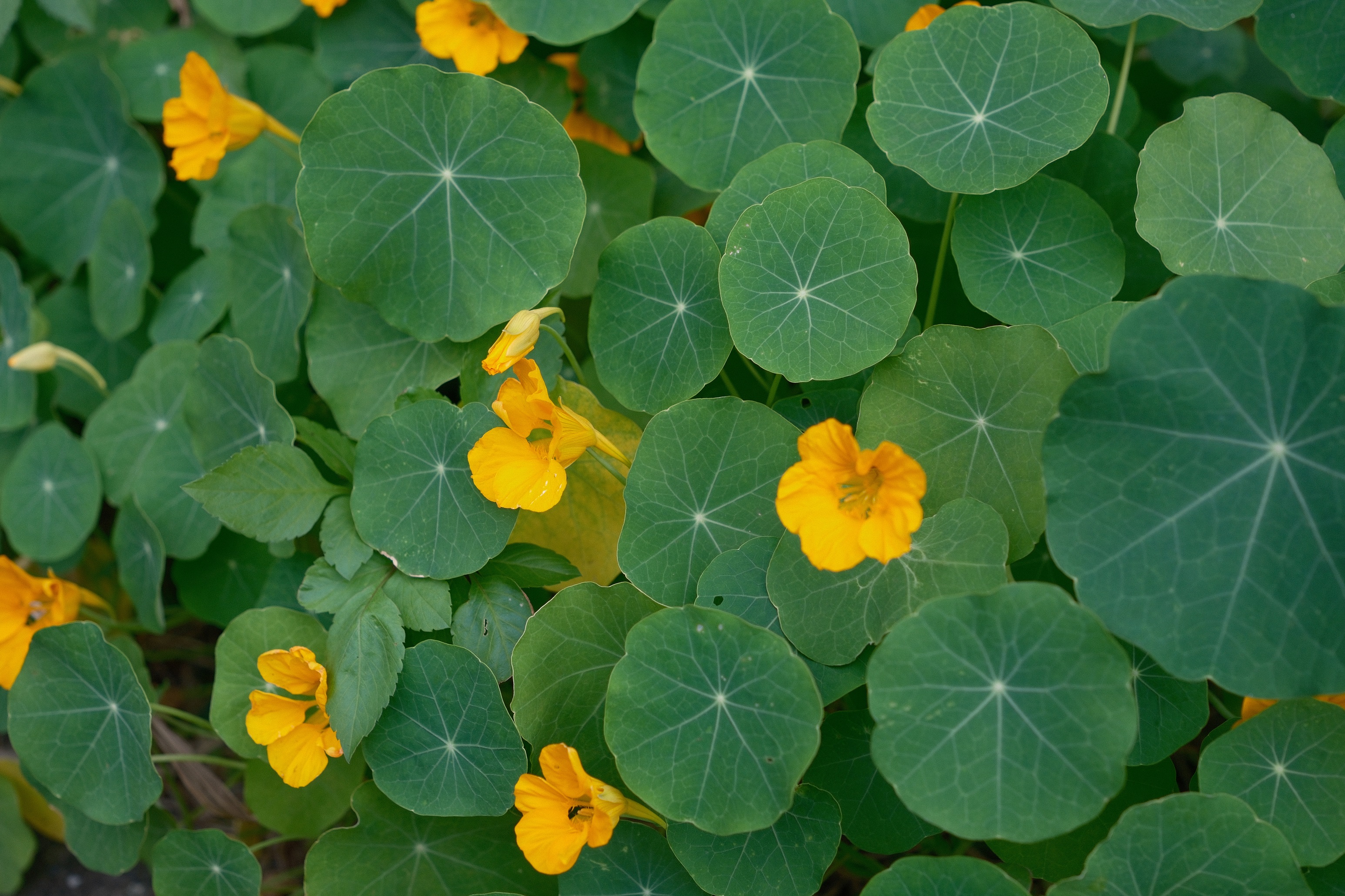 我居住的社區路邊常見金蓮花,金蓮花葉子如蓮葉,蔓延生長也如同水塘中的荷花片片。花朵有兩種顏色,金黃與橘紅。起初兩種顏色的金蓮花壁壘分明,黃是黃,橘是橘,過了幾個季節,興許花粉雜交,小花顏色變成介於兩種花色之間的橙色,竟只剩一個中庸之色。不論顏色深淺,不妨礙它可吃:此植物有芥末味,淡淡的辛辣感,花與葉都可食。