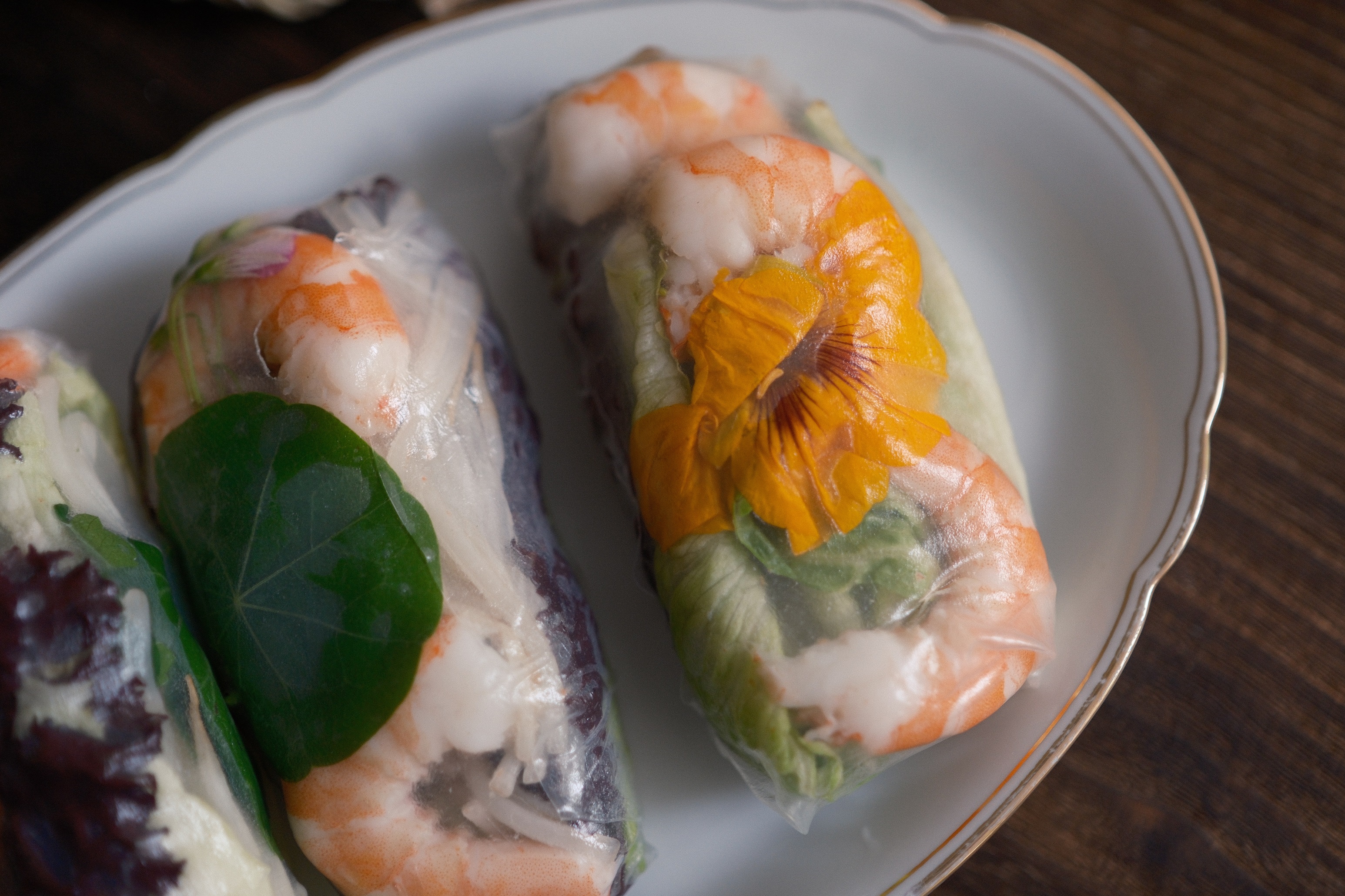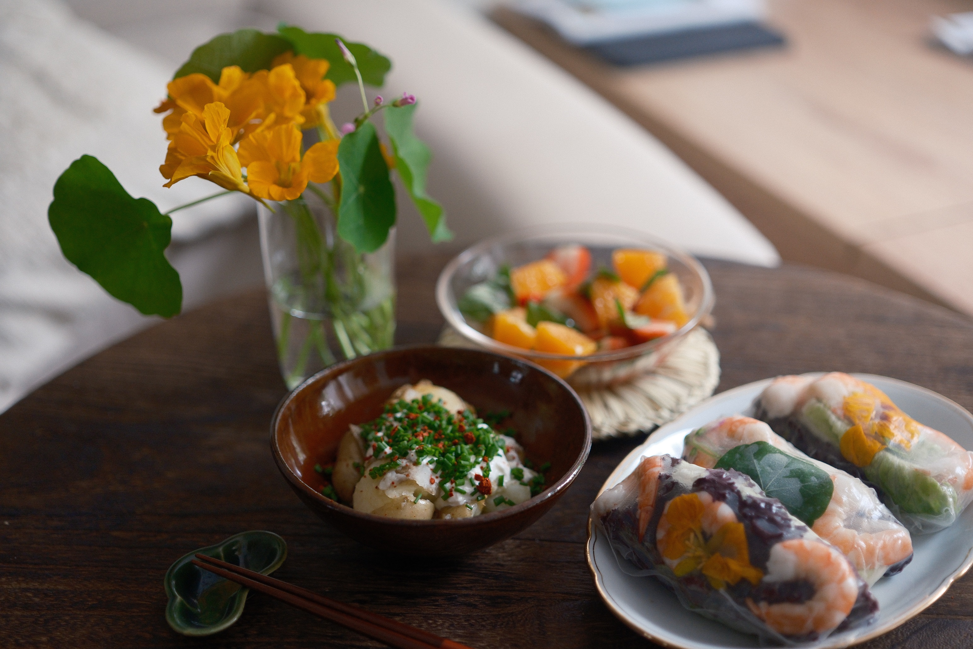 我趕著太陽還掛在天上,摘了些金蓮花和醡漿草,做越南米紙春捲。