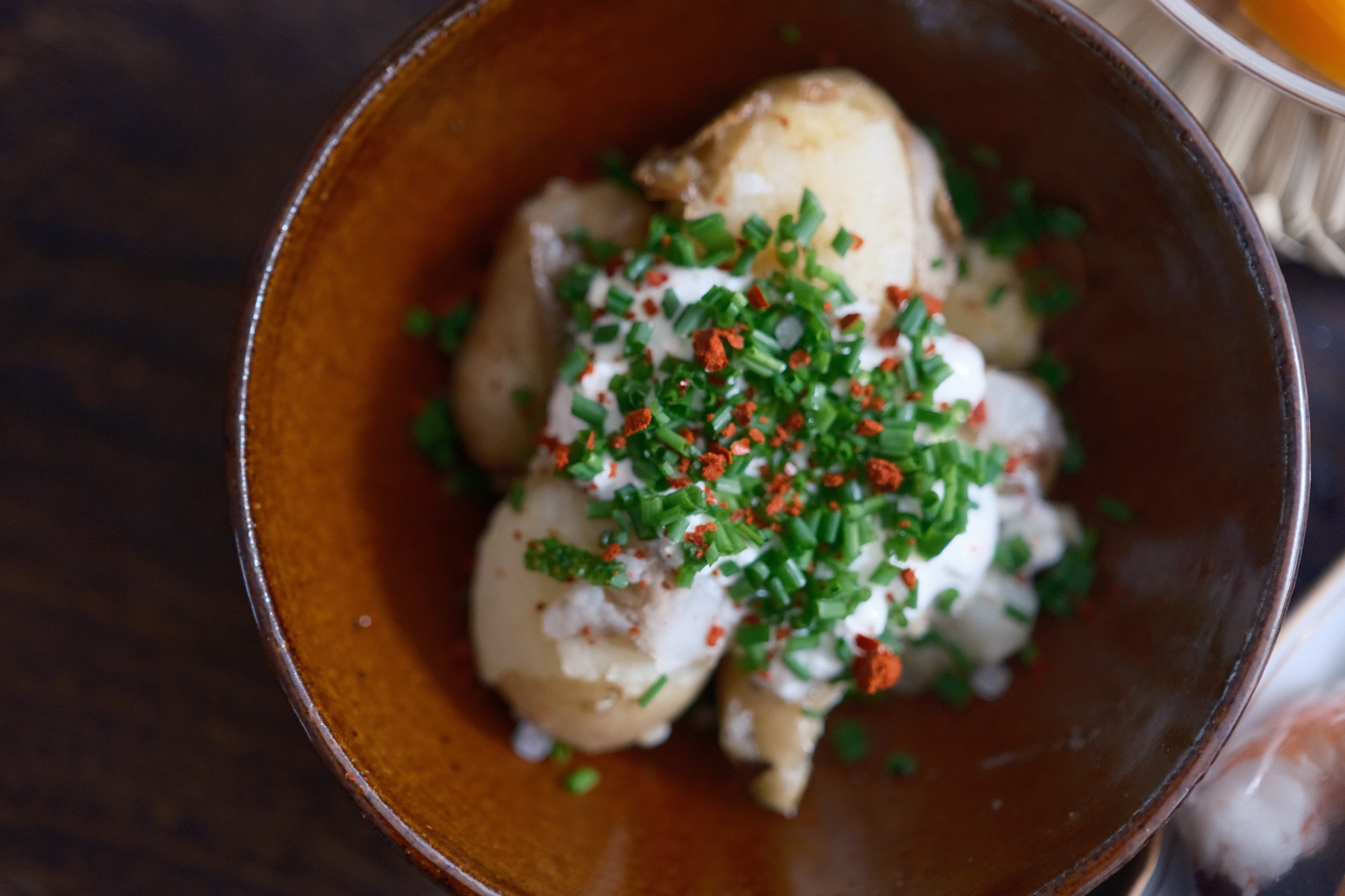 水煮、蒸,皆宜。熱力與水氣穿透這新收小薯,軟化之,換到平底鍋,鍋中下油,放薯,用馬克杯底輕輕壓裂小薯,兩面煎上色,移到器皿中。舀上一大匙酸奶油(sour cream,可用無糖希臘優格取代),灑上鹽、胡椒、韓國粗辣椒粉,剪上碧綠細蔥。