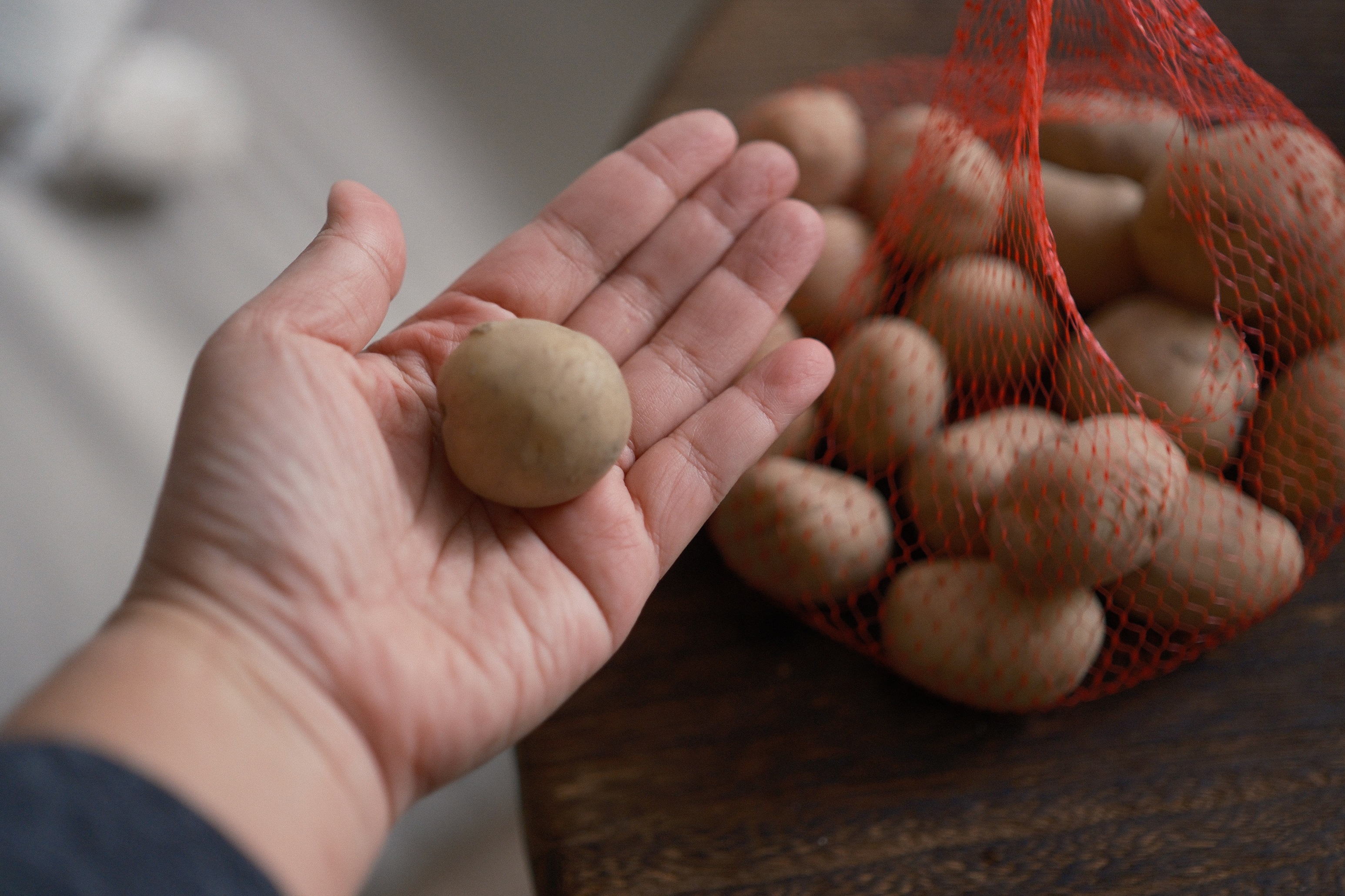 春天有台灣地產的寶寶馬鈴薯,這是採收地中馬鈴薯時,蔓生的澱粉小餘孽。小顆馬鈴薯是格外品,通常不為盤商所愛。但偶爾可以在菜市場見到農家直出的小馬鈴薯,比如我在台北大同區大龍市場菜攤買到的這一網袋雲林來的小傢伙,才 50 元,個頭就跟乒乓球差不多大小。