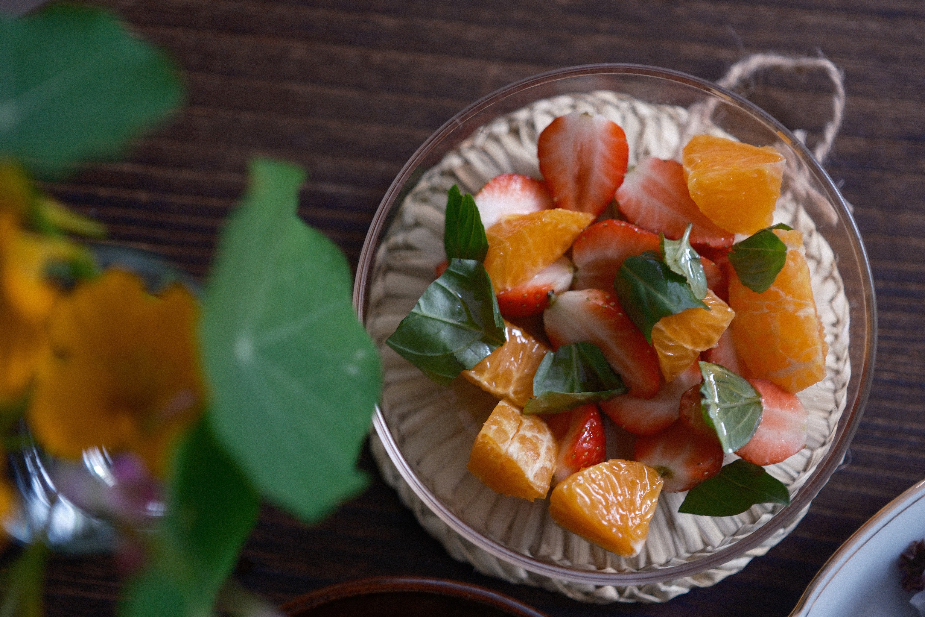 第一個是草莓,在批發市場收攤的時刻,一口氣買了一整籃的香水草莓。香水草莓不負她的名字,酸甜香氣醺人,生食滋味上略遜,口感微甜帶酸偏脆,依然可喜。拿來料理是不錯選擇,足夠的酸香,搭配上甜蜜的茂谷柑,再加上羅勒葉點綴。淋上一圈橄欖油、一圈蜂蜜,撒點鹽,就是好吃的水果沙拉。