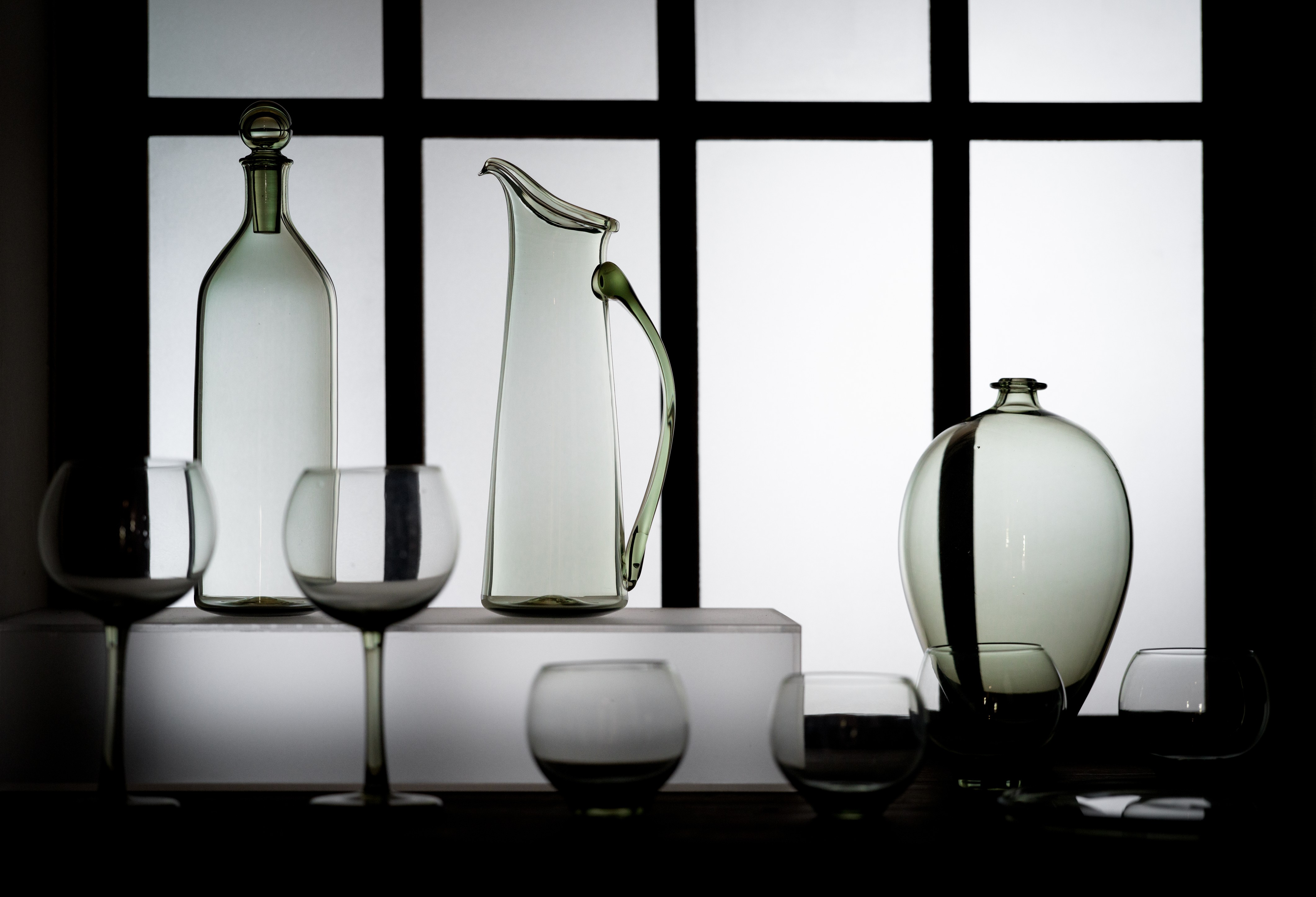 善於運用口吹玻璃技法的有永浩太,不使用任何模具,透過吹氣、金屬夾及鏝刀,讓玻璃在呼吸間塑形,水瓶倒水口處仿若鳥兒準備飛翔的優雅線條及那清澄若黑似綠的色澤,讓人一再賞玩。