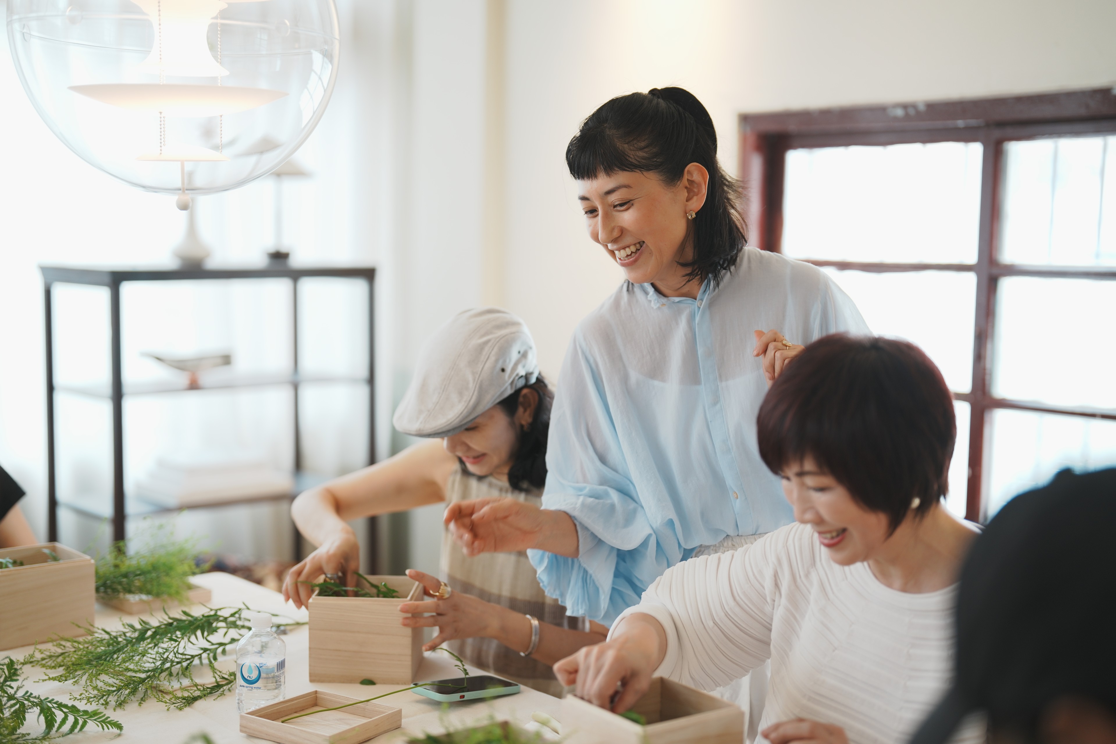 花藝家平井かずみ老師則在「秋日玉手箱的插花一服」花藝工作坊中,帶領大家以秋天柔風吹拂的花景為主題,在小小的玉手木箱中,創造出屬於自己的風景與心景。在工作坊中,她也特別運用大谷哲也及有永浩太的花器進行插花的表演,她笑著分享其實玻璃的花器有許多表現的可能,因為玻璃清澈的特質,所以瓶內水線的高低(瓶中水量的多寡會影響到水線的高低)、瓶中花枝與整體瓶身比例的關係,都可以隨著心情調整,而有全然不同的氛圍。或是在夏天時,在客人來訪前,於花及花瓶上噴些水珠於其上,就能就創造清新自然的氣息。