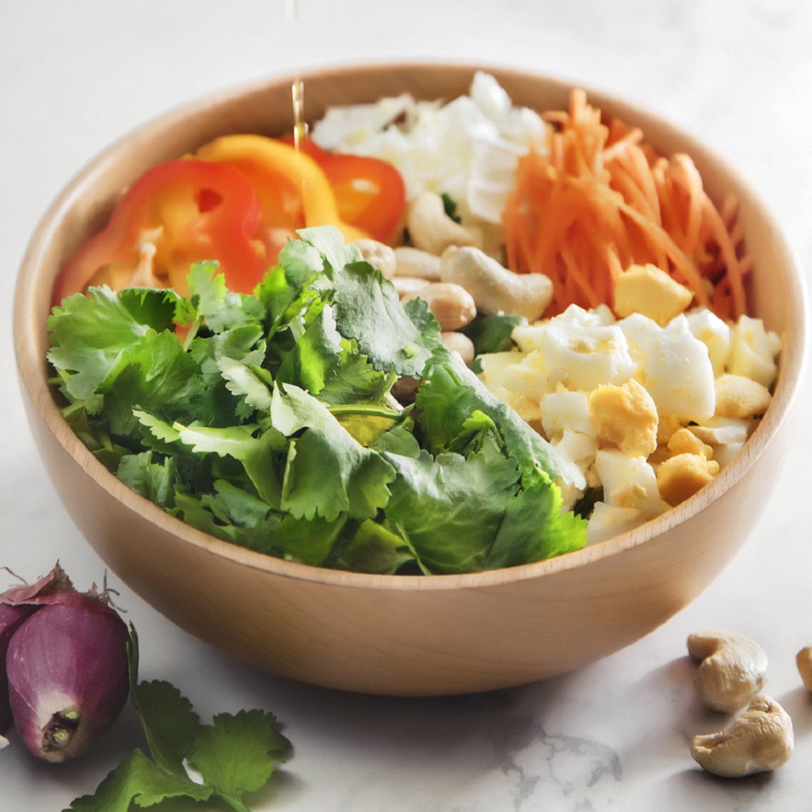堅果和白煮蛋分別以小碗搭配小刀片,以瞬轉功能打成粗粒備用。