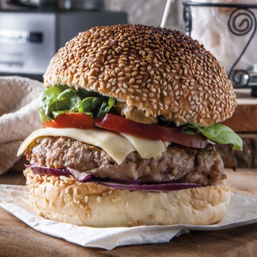 漢堡麵包中各放上一片牛番茄片和生菜,再依序放上煎好的肉餅、起司、焦糖洋蔥即可。