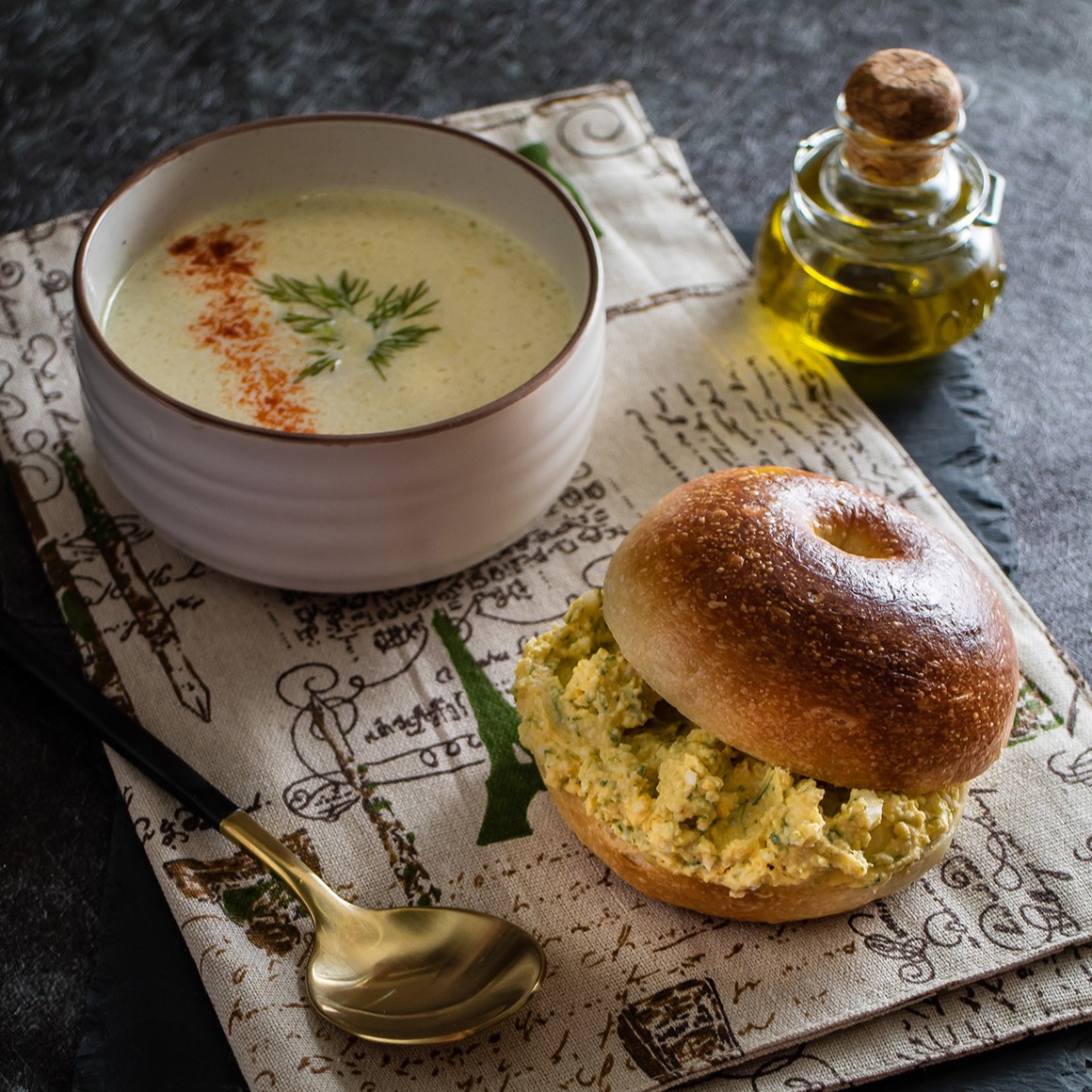 將步驟6與沙拉醬拌勻,加入鹽、胡椒成蛋沙拉後,填入切開的貝果中,夾入小黃瓜片即可。