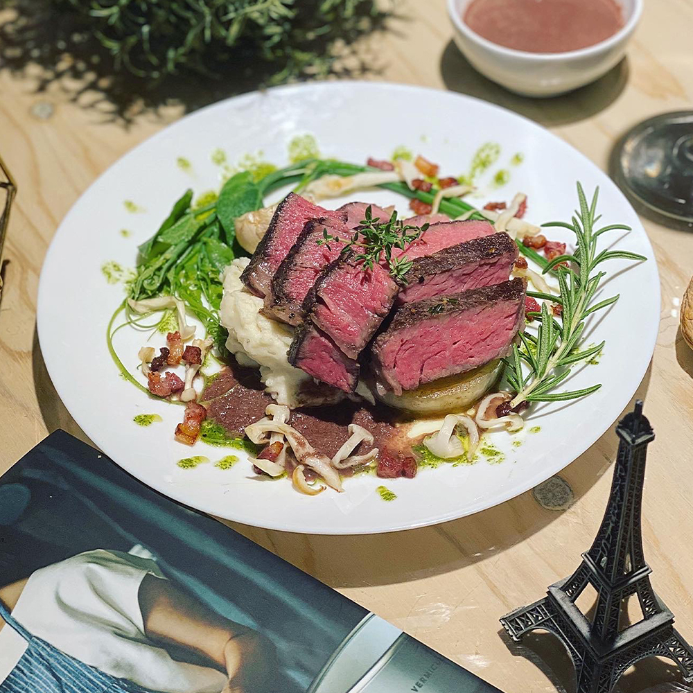 牛排靜止後將肋眼心及老饕上蓋肉分開,去除過於油膩的筋膜後切塊;最後裝盤。