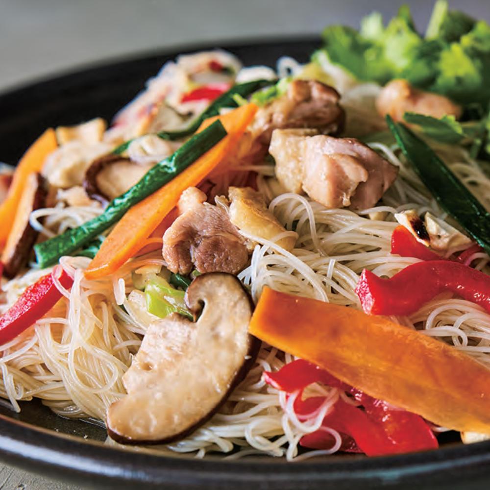 加入紅蘿蔔、韭菜、香菇、青蔥、紅甜椒、鹽、胡椒,炒1分鐘左右,待韭菜軟嫩後,依次加入蠔油、泰國魚露、米粉,以中大火翻炒約1分鐘,直至醬汁快要收乾。裝盤,加入香菜、檸檬,撒上腰果。