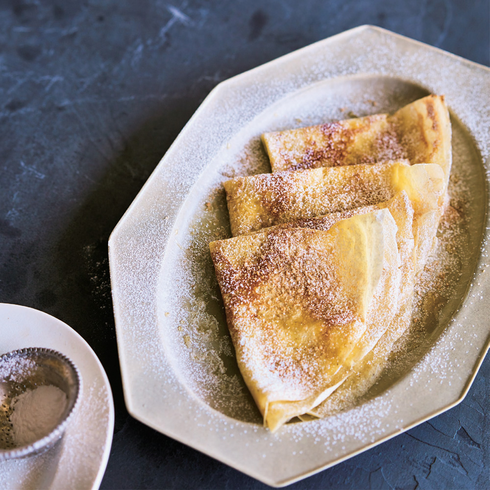 [麵皮製作]在調理盆中加入低筋麵粉、細砂糖、雞蛋及鹽,用打蛋器攪拌至光滑細膩。加入①的焦香奶油,攪拌均勻。逐步加入牛奶並不斷攪拌。待攪拌均勻後以濾網過篩,靜置1小時以上。