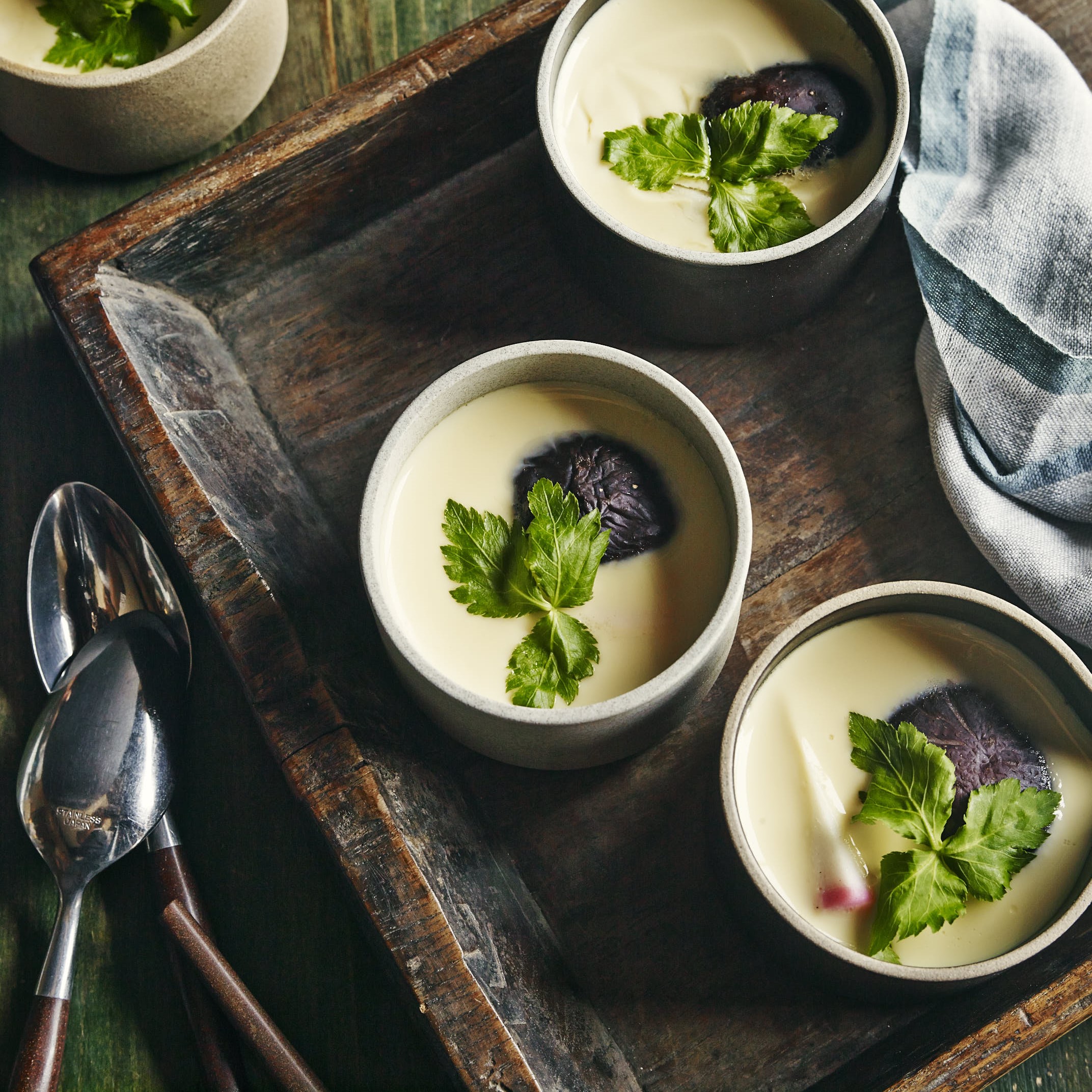 在 IH 琺瑯鑄鐵電子鍋中加入 100ml 水,蓋上鍋蓋,用【中火】加熱3分鐘左右,待冒出大量蒸汽後,打開鍋蓋,鋪上烤盤紙,擺上①。蓋上鍋蓋,以95℃【低溫】30分鐘。取出後揭下保鮮膜,擺上山芹葉,即可完成。