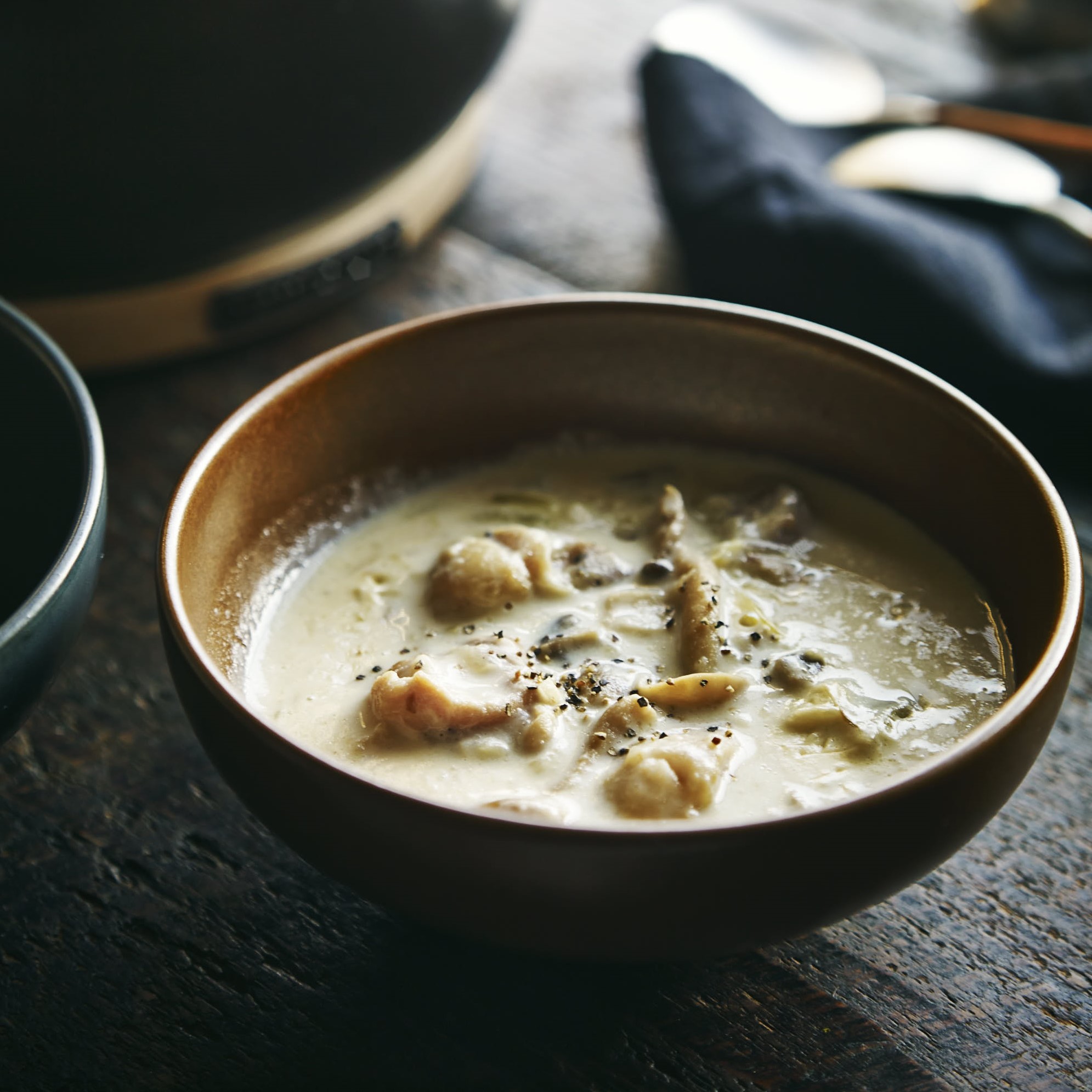 雞肉與蘑菇的組合帶來豐富的風味。鮮奶油令湯汁更加濃郁。混合使用3種蘑菇,令美味再度升級。