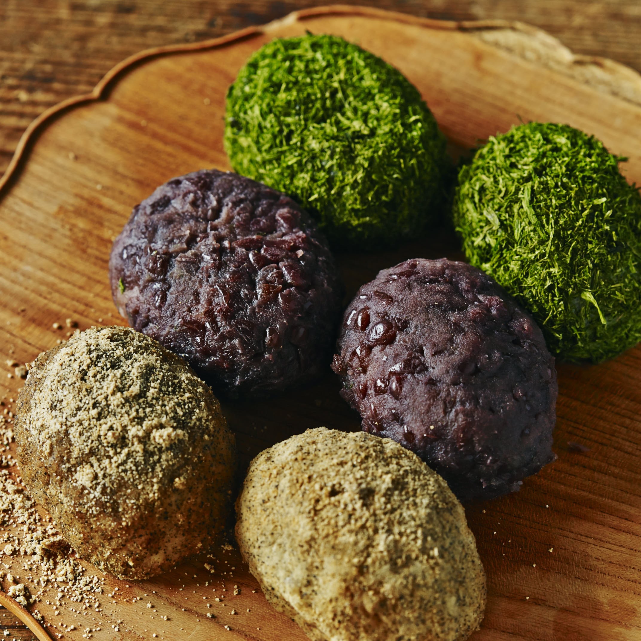 首先,用適量的紅豆餡將飯糰裹起來,便是「紅豆萩餅」了。 其次,製作12個約5cm大小的紅豆球,分別用飯糰包裹起來,各取6個分別撒上混合好的[材料A]和青海苔,「黃豆粉萩餅和青海苔萩餅」便做好了。