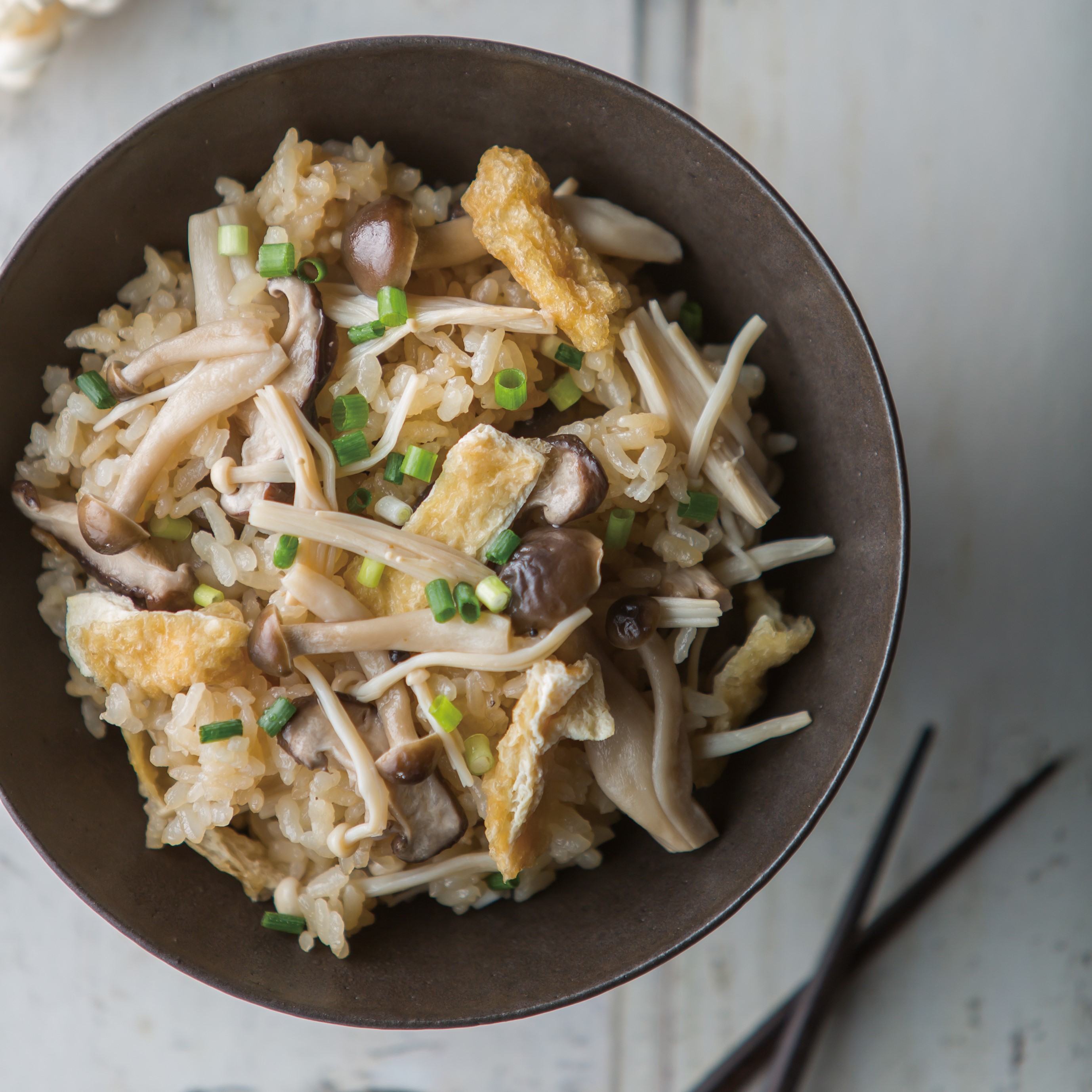 於②的米上鋪好香菇、鴻喜菇、金針菇、豆皮,蓋上鍋蓋中火加熱,煮沸至大量蒸氣噴出,鍋子邊緣滴出水滴。