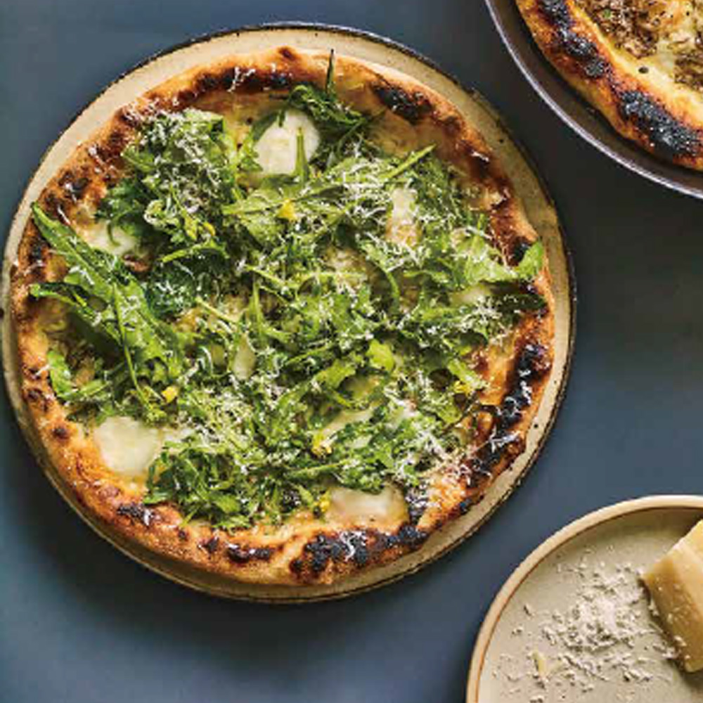 將做好的披薩餅皮鋪在平底鍋上,依次擺滿①的起司碎及油漬醃鯷魚,以中火加熱2分鐘左右。餅皮底部煎出色澤後,放進預熱至300℃的烤箱中烤3分鐘左右。餅皮周圍烤出色澤後取出,撒上莫札瑞拉起司、剩餘的芝麻葉及[材料B] ,如果有芝麻葉花也可撒上。