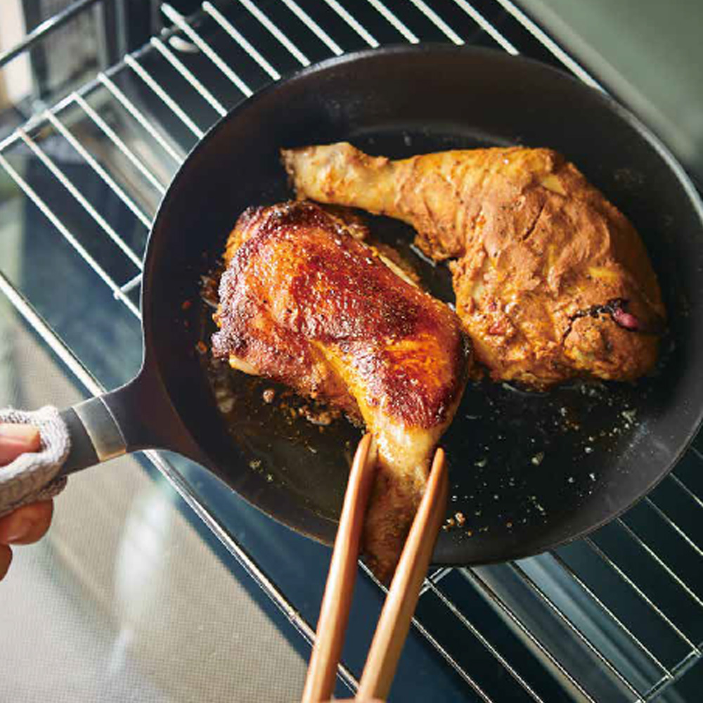 雞皮煎出色澤後,放進預熱至250℃的烤箱中烤12分鐘。用竹籤刺看看,若流出透明肉汁便可取出,雞皮面朝上即完成。