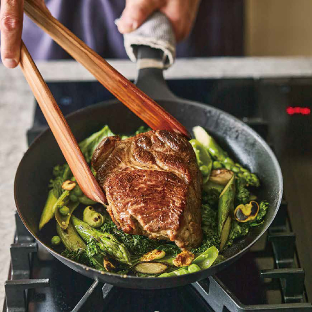 使用鑄鐵煎盤可同時搞定主菜的肉類料理及搭配的香煎蔬菜。香草醬讓料理清爽不膩口。