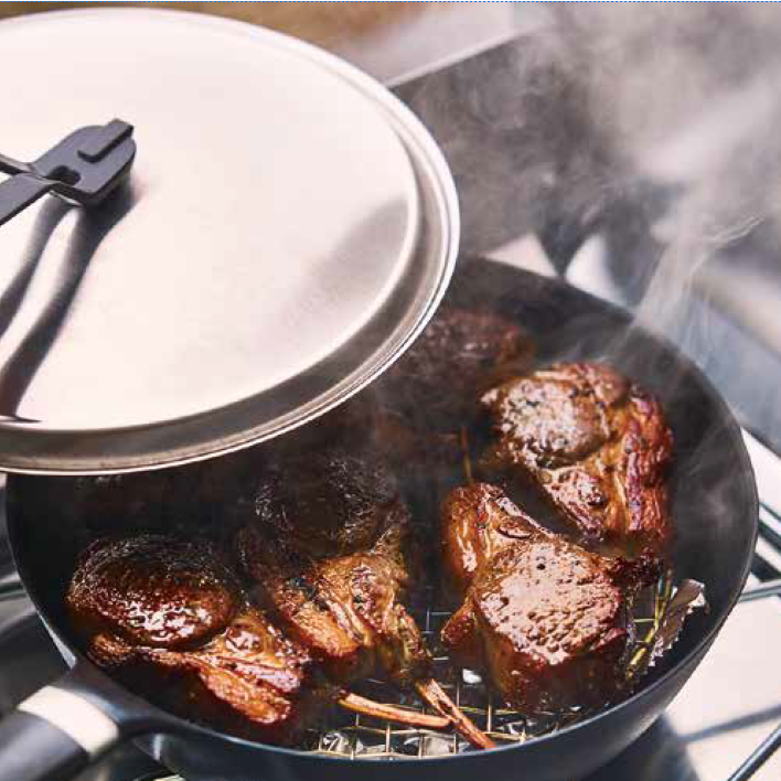待平底鍋冒煙後,放入③的小羊肉,蓋上鍋蓋,以小火加熱3分鐘左右關火。煙燻放置5分鐘左右至煙燻的香味附著到小羊排上即完成(可藉由煙量來調整煙燻程度)。